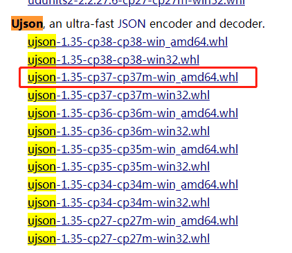 找适合自己的版本,我是python 3 .7,windows 64位系统,所以选择“ujson-1.35-cp37-cp37m-win_amd64.whl”。
