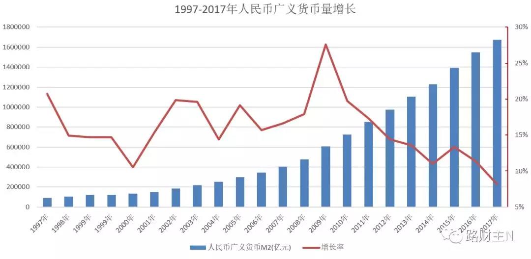 从1997年开始人民币广义货币增长率,由以前的20-30%以上降低到了15-20%,15%左右的货币投放增长速度,在中国这里就叫“稳健”——
