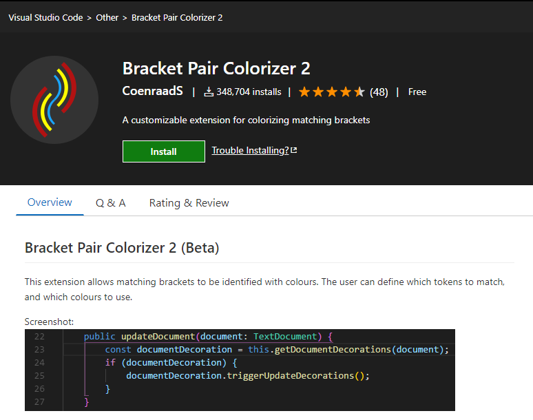 More than a feature to help us use brackets, I would say that the extension increases the readability of the code. For example, if it takes some time for a developer to read code and understand what the code does, with the help of brackets it is, even more, easier to recognize the start of the code blocks and end of the code blocks thus making it readable saving lots of time for the developers. There is also a configuration option available where the user can choose which color they would like to use and which tokens they would like to match.
