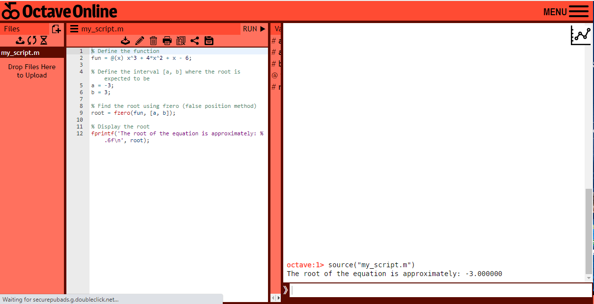 এবার ম্যাটল্যাব এ রুট খোজার প্রোগ্রাম এক্সিকিউট করে দিলাম। যেনো এটি প্রোগ্রাম রান করে রুট এর মান বের করতে পারে।