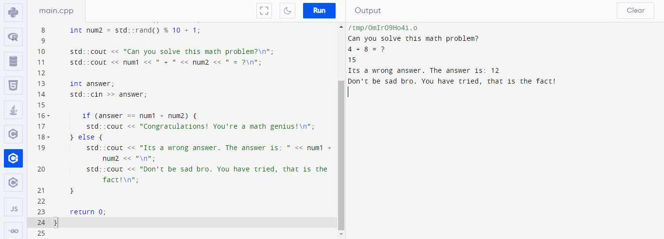else {std::cout << "Its a wrong answer. The answer is: " << num1 + num2 << "\n"