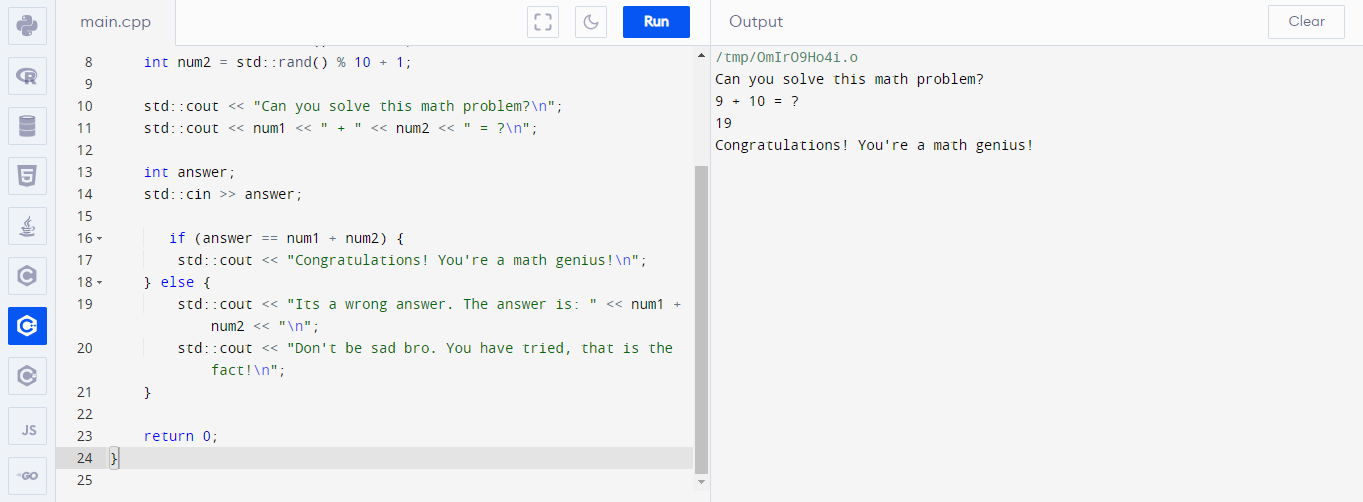 std::cout << "Congratulations! You're a math genius!\n";