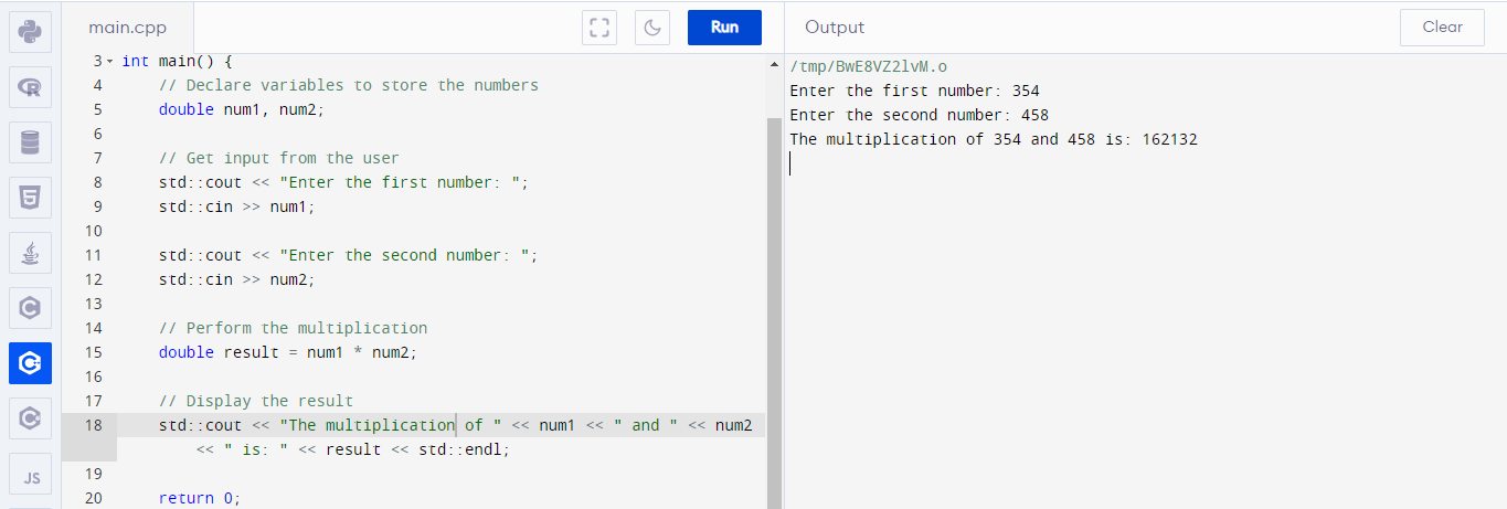 std::cout << "The multiplication of " << num1 << " and " << num2 << " is: " << result << std::endl;