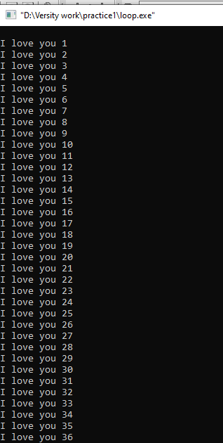 এই ছিলো সেই প্রোগ্রাম রান করার পর একটি স্ক্রিনশট৷ এভাবে এটি ১০০ বার পর্যন্ত দেখাবে। আপনি যদি while লুপ এ ওখানে ১০০ এর বদলে ১০০০ দেন। থাহলে ১০০০ বার I love you লেখা আসবে। তারপর এটি কপি করে বউ কে মেরে দিবেন। বউ তো ভাববে আহা জামাই আমার কত কষ্ট করে টাইপ করেছে।