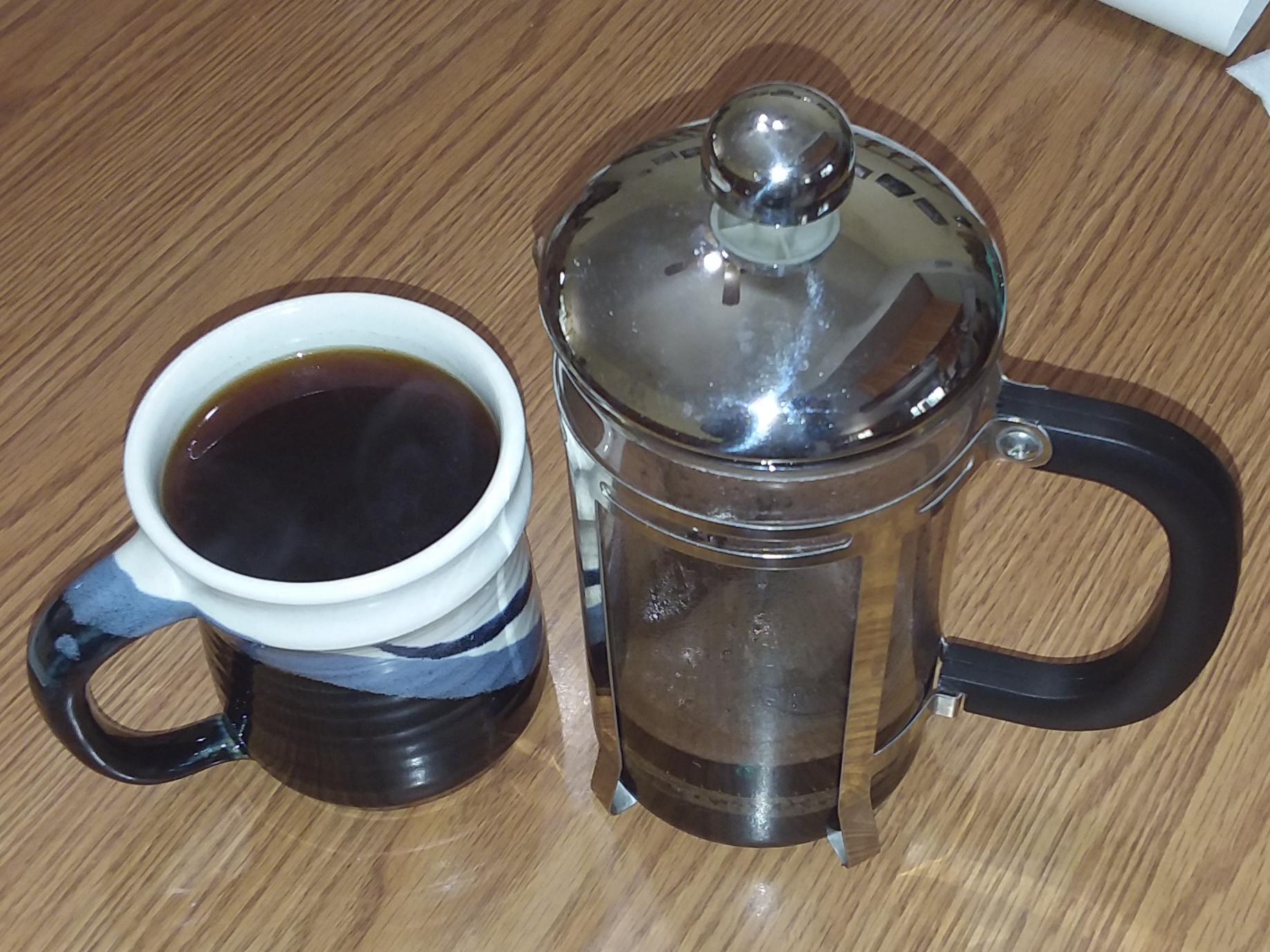 Locally-roasted fair-trade Sumatran coffee in a locally-made ceramic mug, brewed in a french press.