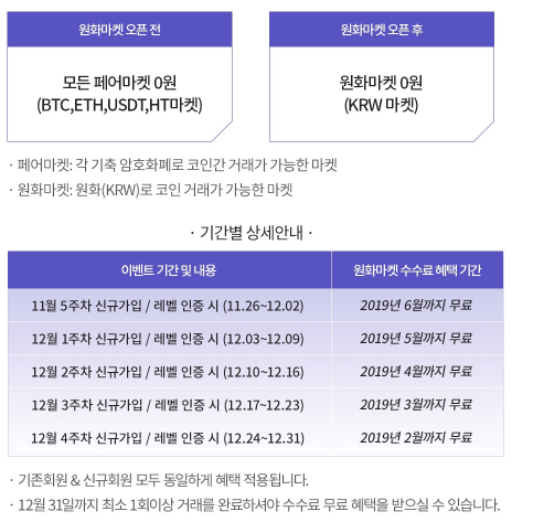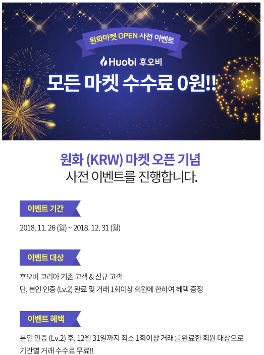 정확한 시기는 추후 공지사항을 통해 안내드릴 예정이며, 후오비 코리아 원화마켓 오픈을 기념하여 “거래수수료 전면 무료” 혜택의 사전 이벤트를 진행합니다.