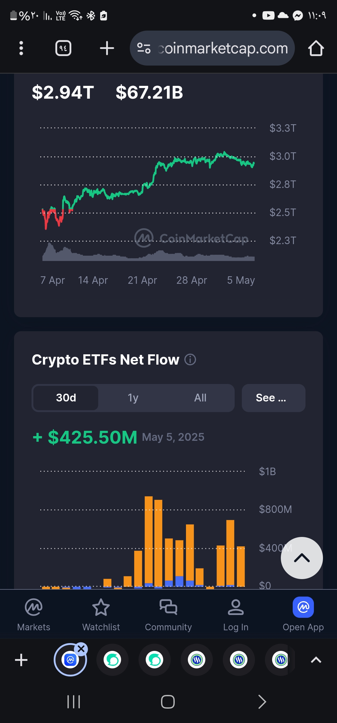 استقر الماركت كاب اليوم على 2.94 تلريون دولار في زيادة مقدارها 10 مليار دولار عن اليوم السابق