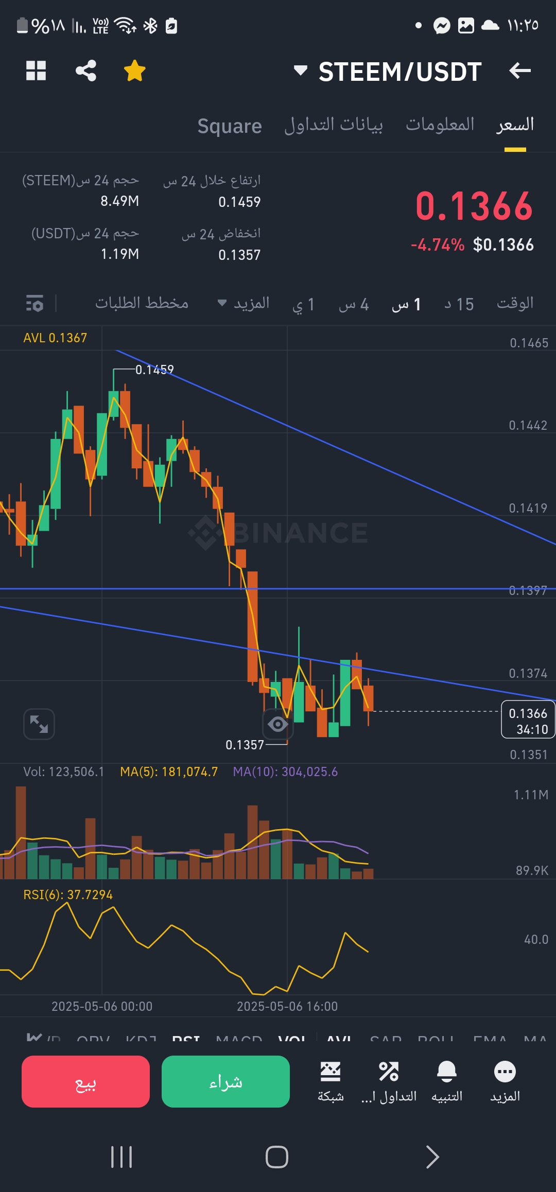 وانخفض سعر ستيم اليوم الى مستوى جديد فوصل 0.136 حيث ان سعر الستيم قد كسر مستوى الدعم والترند الهابط وهو الان تحت الترند الهابط