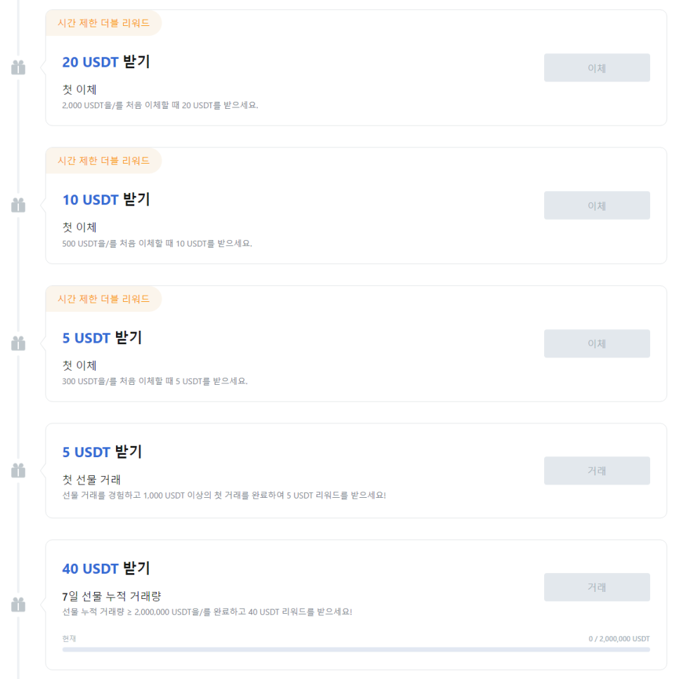 그리고, 신규 가입 후 진행할 수 있는 이벤트들도 존재합니다. 입금 금액에 따라 리워드를 주기도 하고 거래량에 따라 리워드를 주기도 합니다. 이 부분은 직접 리워드 페이지에서 확인 후 이용해보는 것도 좋습니다.