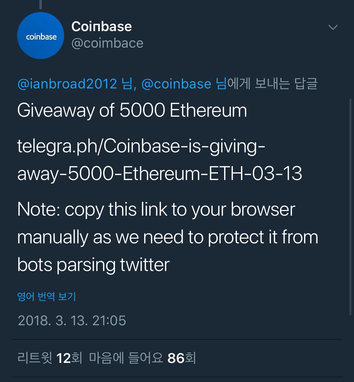 적극적으로 대응한 효과가 있는지 최근 트윗에는 사기답글이 하나도 안달리는중.
