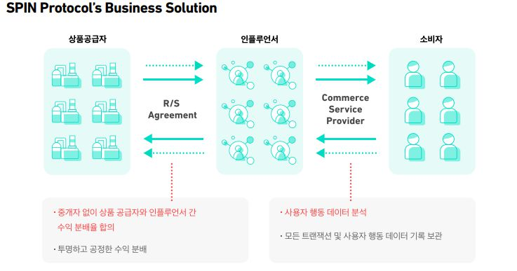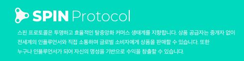- 인플루언서의 제품 판매 지원 활동(마케팅/홍보)에 대한 투명한 평가와 그에 상응하는 합당한 보상을 스핀프로토콜을 통해 진행하고자 함(제품 공급자와 인플루언서 간 스마트 컨트렉트 기반으로 수익배분 계약을 맺고 투명하게 수익 기여 활동을 평가/SPIN 토큰으로 정산 진행)
