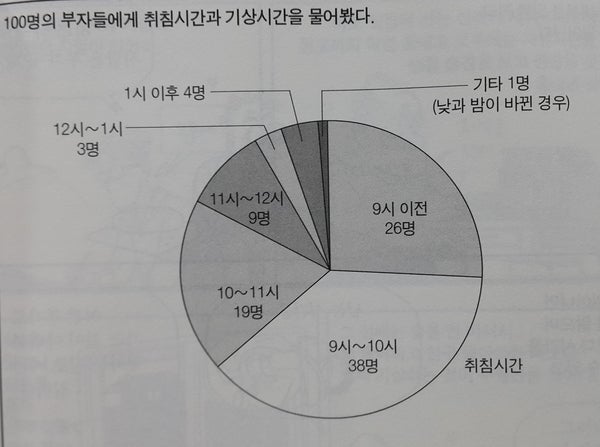 저 그래프에 나온 부자들은 부자가 된 뒤에 일찍 자고 일찍 일어나는 게 아니라 일찍 자고 일찍 일어나서 하루를 부지런하게 살았기 때문에 부자가 되었다는 사실이죠 ^^