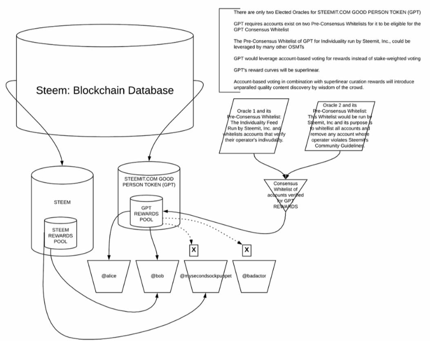 오라클1을 통해 스팀잇 측에서 이것이 1인 1계정인지 개별성을 판독하고, 오라클2를 통해 스팀잇이 제시하는 가이드라인을 준수하는지의 여부를 확인하여 화이트리스트를 작성하겠다는 계획이죠. 이때 신원이 통과되지 않은 유저의 경우, 해당 유저의 보상금이 다시 GPT의 보상풀로 돌아가게끔 설계도를 짠 상태입니다.