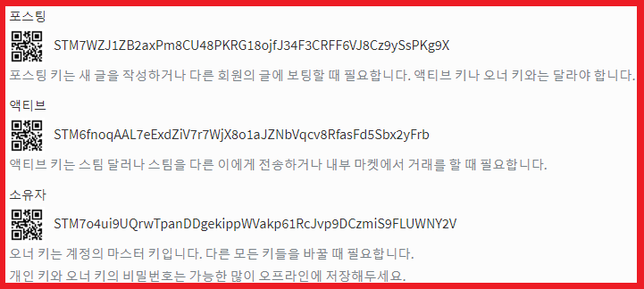 스팀 블록체인의 경우 posting key, active key, owner key로 구성되어 있습니다.