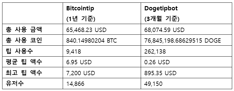 비트코인팁이 개발된지 처음 1년간 사용된 금액은 약 65,000불이며, 팁 사용수는 9,418번이었다. 이를 사용한 유저수는 14,866명이었다. 하지만 도지팁봇은 개발된지 3개월 만에 약 68,000불이 사용되었으며, 팁봇 사용수는 약 26만번이었다. 이를 사용한 유저수도 49,150명에 달했다. 유저들은 이러한 팁봇을 사용하여 매우 손쉽게 기부와 결제를 할 수 있게 되었다. 팁봇을 사용하기 위해 필요한 것은 오직 “/dogetipbot 50 doge”를 치기만 하면 된다.