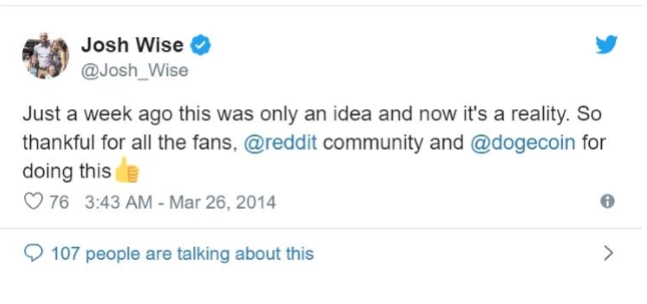 2014년 5월 도지코인 커뮤니티는 도지코인 6,780만개(당시 55,000달러 상당)를 모금하여 나스카 드라이버인 조쉬 와이즈(Josh Wise)를 후원했다.