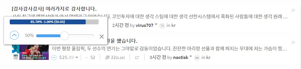 사실 이번 포스팅의 주된 목적은 https://steemkr.com/ 사이트를 소개하기 위함이었습니다. 스티밋에 다른 UI(옷)을 입힌 여러가지 사이트가 있던데 저는 스팀KR이 가장 스티밋에 가까워서 적응하기 편했고, 스팀파워가 낮아도 보팅을 조절할 수 있는 기능을 지원합니다.(저는 공식 스티밋, 스팀KR 둘 다 사용하고 있습니다. 글을 작성할 때는 항상 공식 스티밋홈페이지를 이용하고 있습니다.)