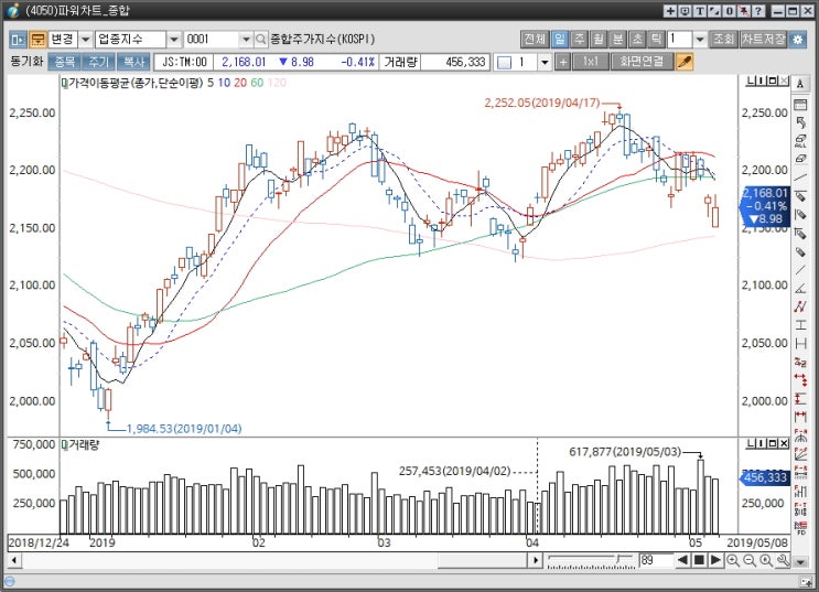 코스피 지수 일봉차트. 2019. 05. 08. (수) 장마감기준