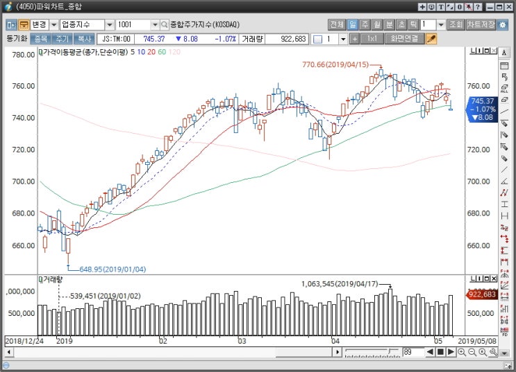 코스닥 지수 일봉차트. 2019. 05. 08. (수) 장마감기준