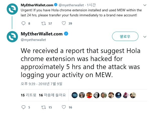 마이이더월렛이 방금 전 긴급 공지를 통해 "크롬 이용자 중 'Hola' VPN 애플리케이션을 사용하고 있으며, 지난 24시간 내 해당 월렛을 이용한 적이 있는 사용자는 즉각 새로운 주소로 자산을 옮겨야 한다"고 공지했다. 해당 공지에 따르면 Hola가 5시간 전 공격을 당했으며 해커는 마이이더월렛을 통해 해당 앱 이용자들 계좌를 맘대로 접근중이다.