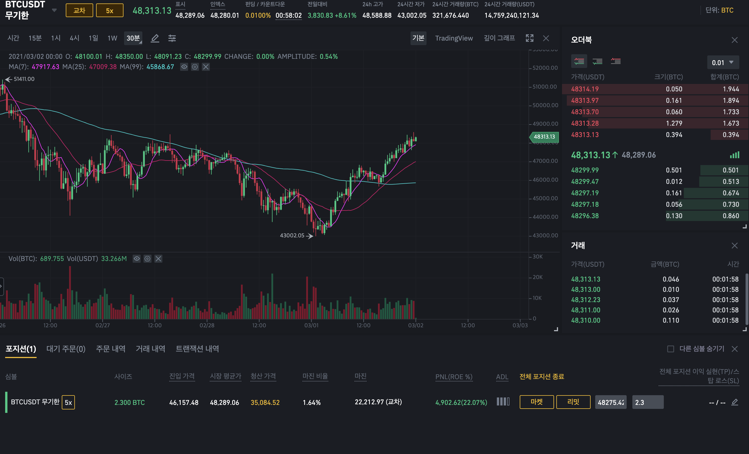 비트코인이 저점을 찍고 반등을 합니다.shoulderjoint (60)in #coinpan • 5 years ago 46000달러 부근에서 롱포지션을 잡아봤습니다. 선물은 처음이라 모르는게 아직 많은데요. 초심자의 행운이라고 했던가요 다행히도 수익구간입니다..^^; #kr #aaa #zzan #sct-freeboard #sct