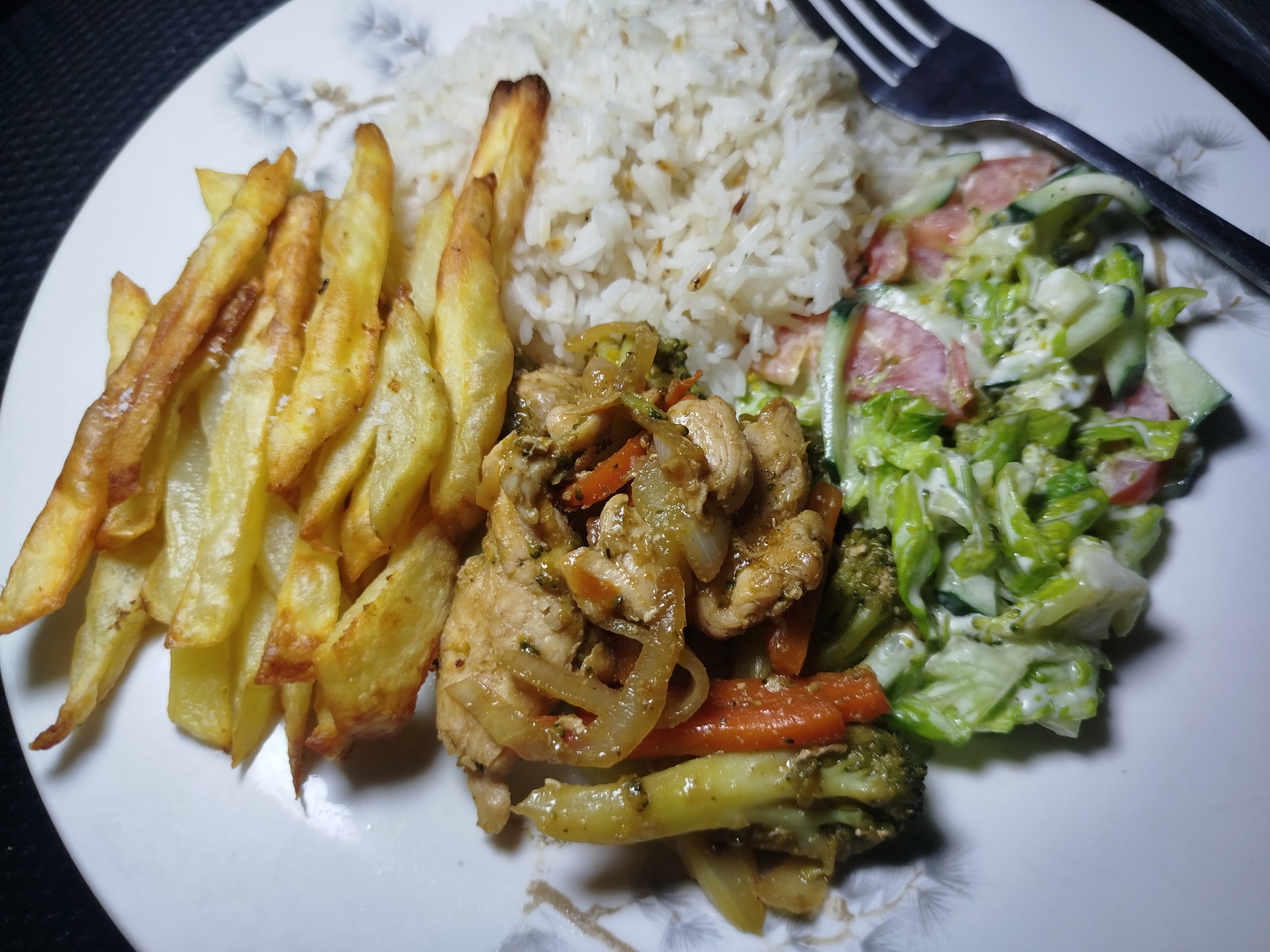Terminé de lavar, la limpieza y organización del cuarto y llegó la hora de cocinar el almuerzo, entonces me puse a preparar una ensalada, arroz y pollo con vegetales muy delicioso, también hice las papas en la freidora de aire y quedan fabulosas.