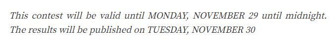 Este concurso estará vigente hasta el JUEVES 9 DE DICIEMBRE hasta la media noche. Los resultados serán publicados el VIERNES 10 DE NOVIEMBRE