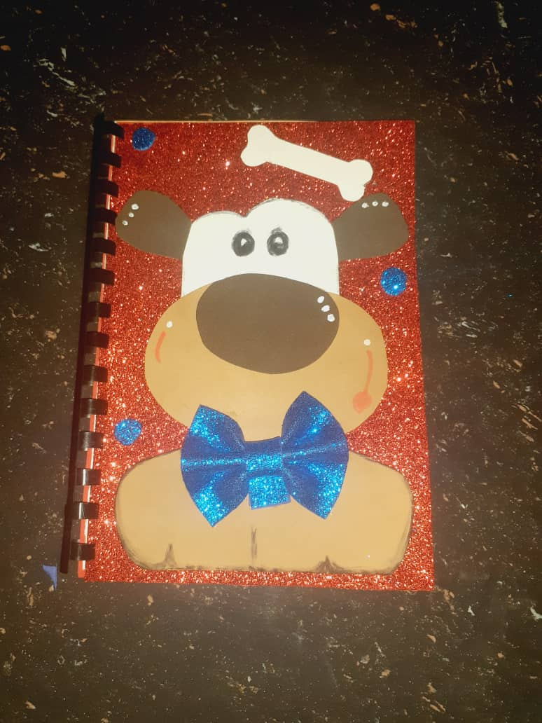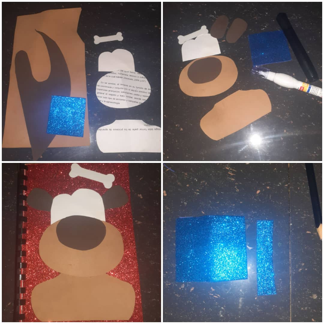 Que mejor portada para esta historia que la figura de un perrito, algo fácil de hacer si tenemos cartón marrón, un poco de pintura negra y papel blanco, tijera, pega y un poco de foami escarchado color azul para hacerle un hermoso lazo 😍.