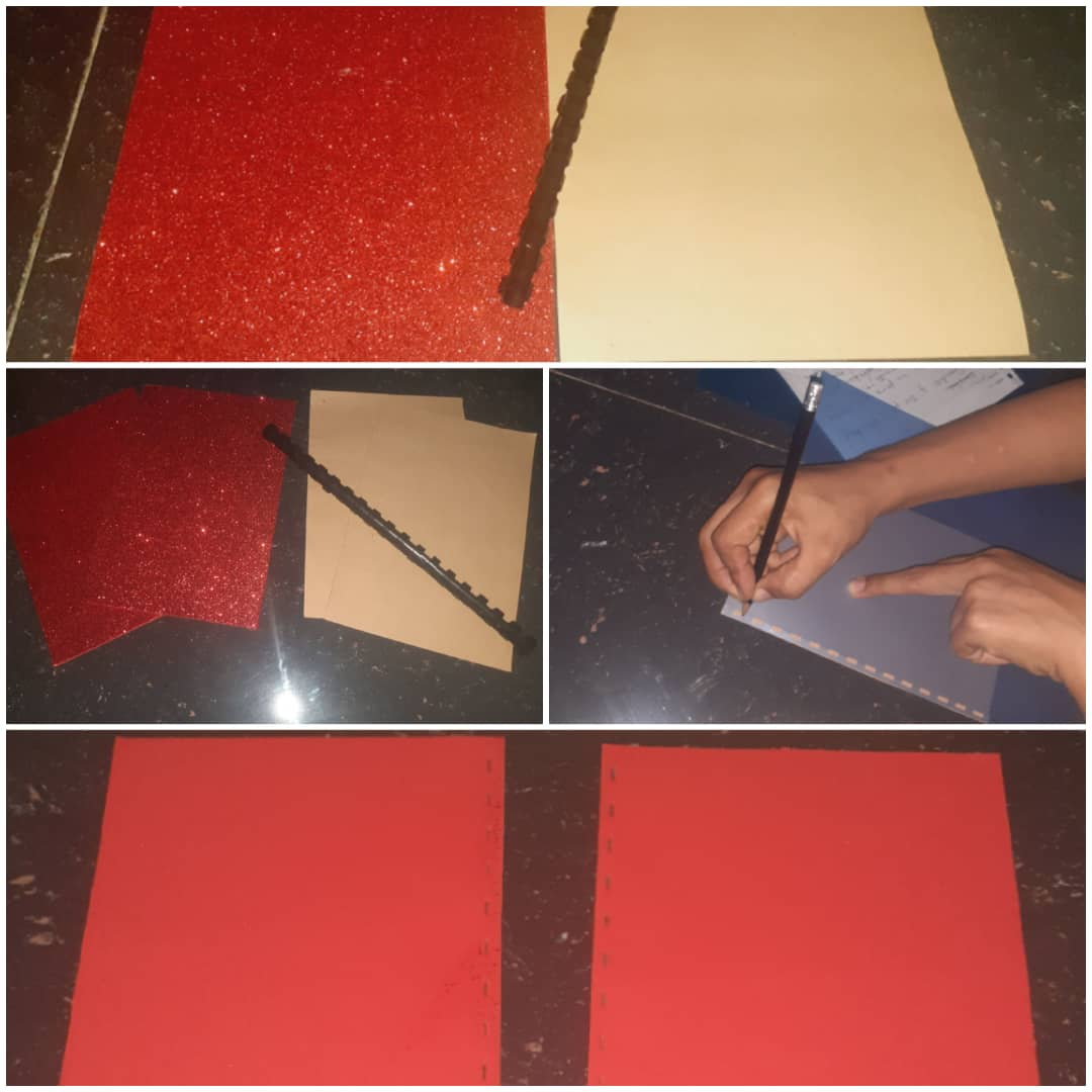 Marcando las hojas para los agujerosCon un lápiz grafito se hicieron todas las marcas correspondientes a la espiral que se usaría para encuadernar, es importante que todas las marcas de todas las páginas coincidan para que se pueda colocar correctamente la espiral brindando una agradable sensación al cambiar de página en la lectura.