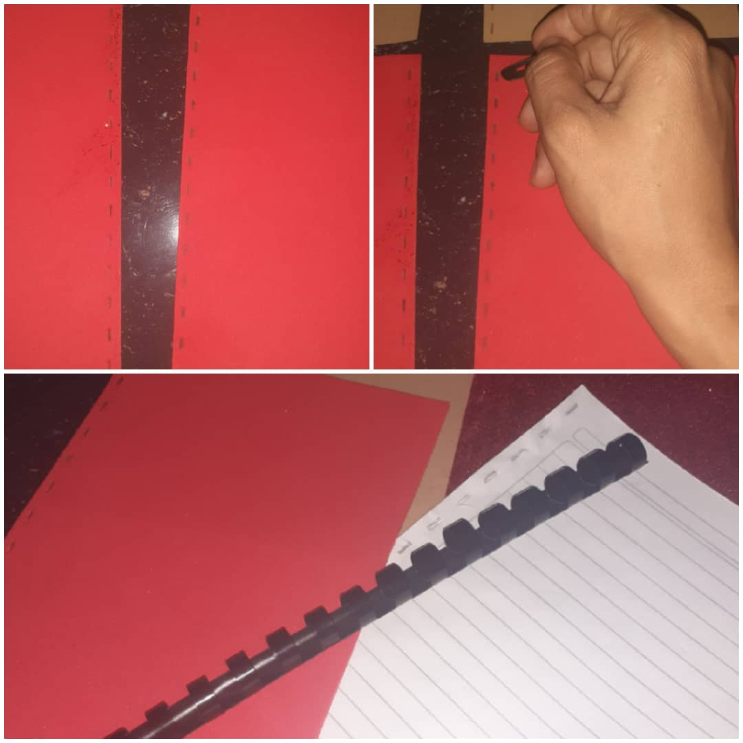 Haciéndo los agujeros a las páginasUna vez hechos todos los agujeros se coloca la espiral y de esa forma tenemos listo el libro... al menos en su forma más básica.