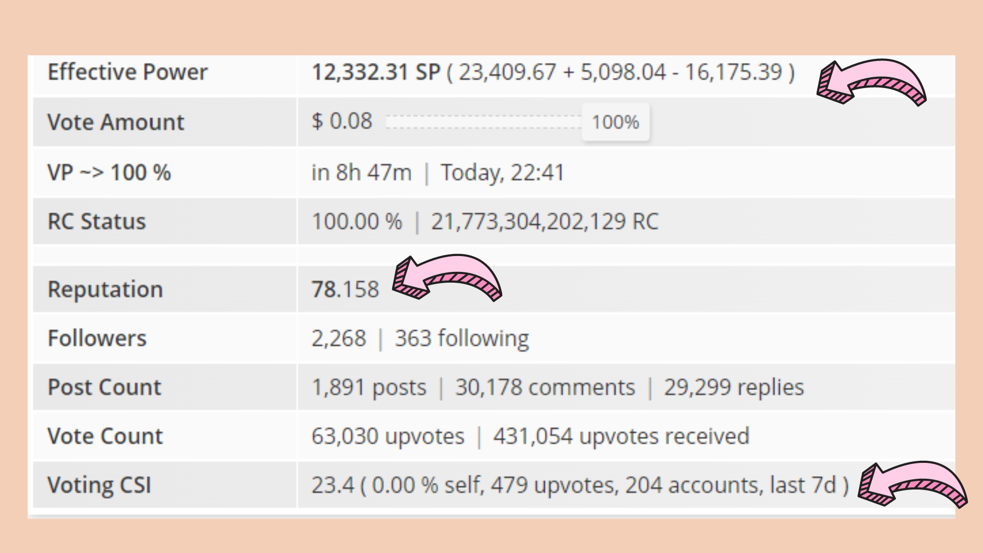 Como pueden visualizar en las imágenes cuento con 23,409.67 de Steem Power. En 1 mes mi cuenta ha aumentado 1.843,16. Cuento con una reputación de 78.158 y un CSI de 23.4.