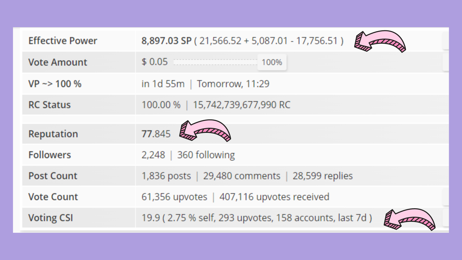 Como pueden visualizar en las imágenes cuento con 21,566.51 de Steem Power. En 1 mes mi cuenta ha aumentado 1.762,53. Cuento con una reputación de 77.845 y un CSI de 19.9.