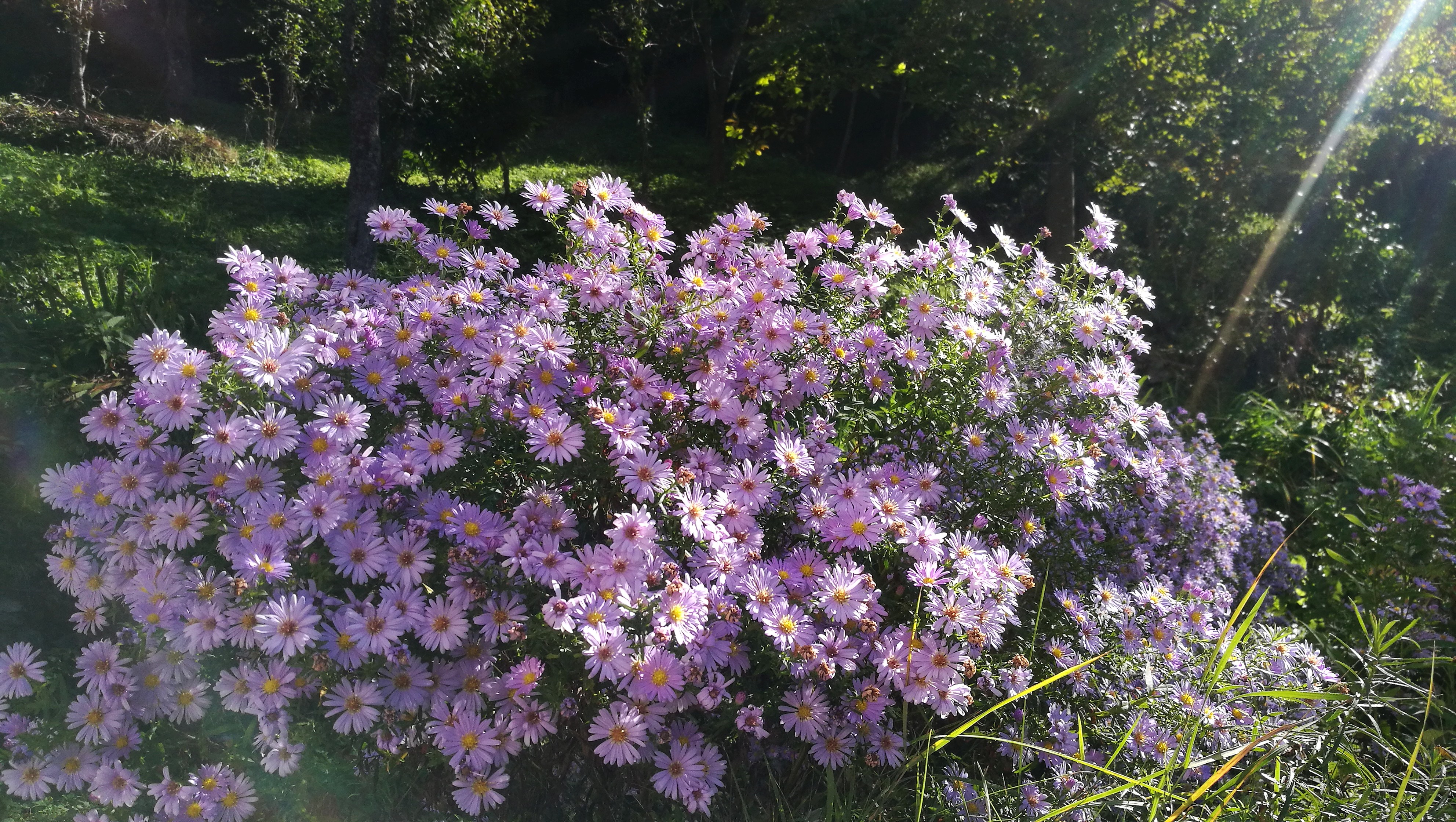 Neighbor has a lovely garden, I photographed these in the late morning when they finally get some sunlight. But it's in such a spot that at that time there's no way not to get the sun into the camera too.