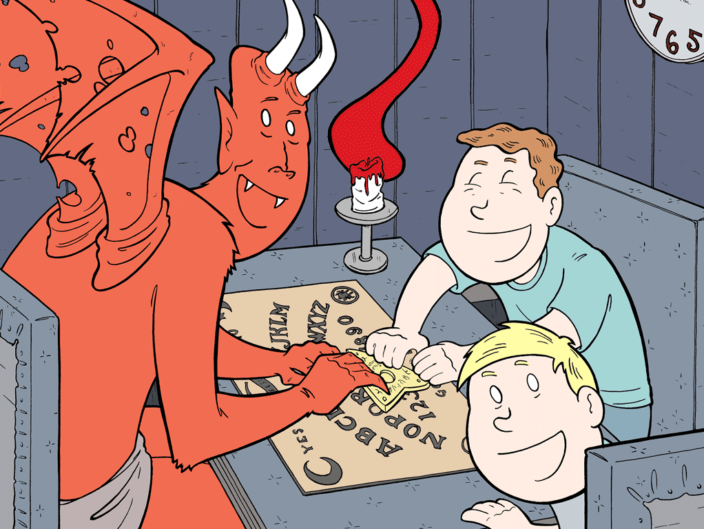 Last but not least is a gif of...well, I suppose a fictional ad for a Ouija board. This is on where my old school style really is well suited, just the correct amount of retro in the look to amplify how absurd the whole notion is. Every cell drawn by hand and inked with a brush, effects done digitally. I may be biased, but it's pretty damn good.