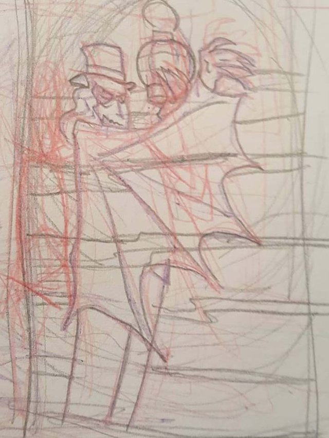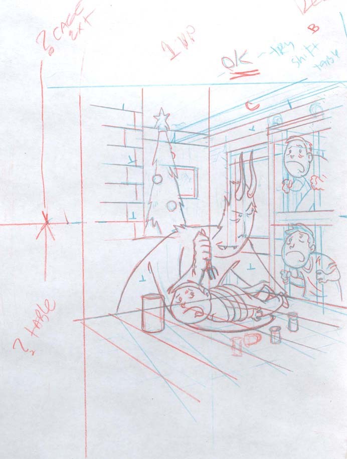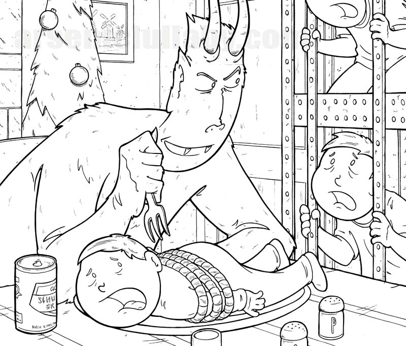The second piece is a Krampus illustration of mine, which technically seems like a seasonal thing, but to my mind frightened children about to meet a sorry fate at the hands of some monster is good year round. Here's the rough draft...