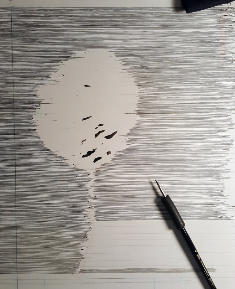 I don't know how large he drew, but I know how thick my brush strokes are, how long I can sustain a brush stroke and what a scanner is capable of picking up. So, I made the background layer roughly 9x7 inches. Which is a hell of a lot of brush strokes...