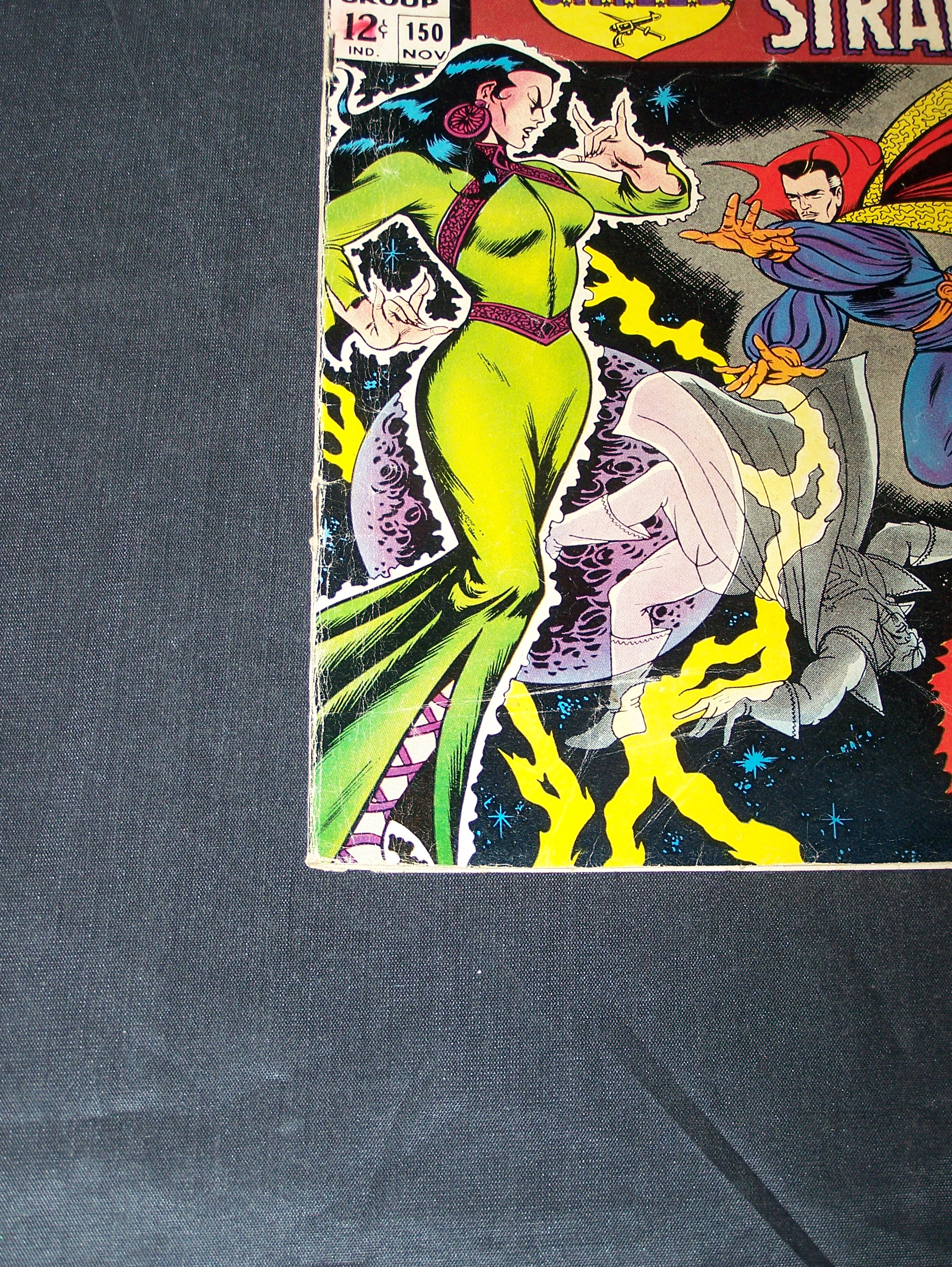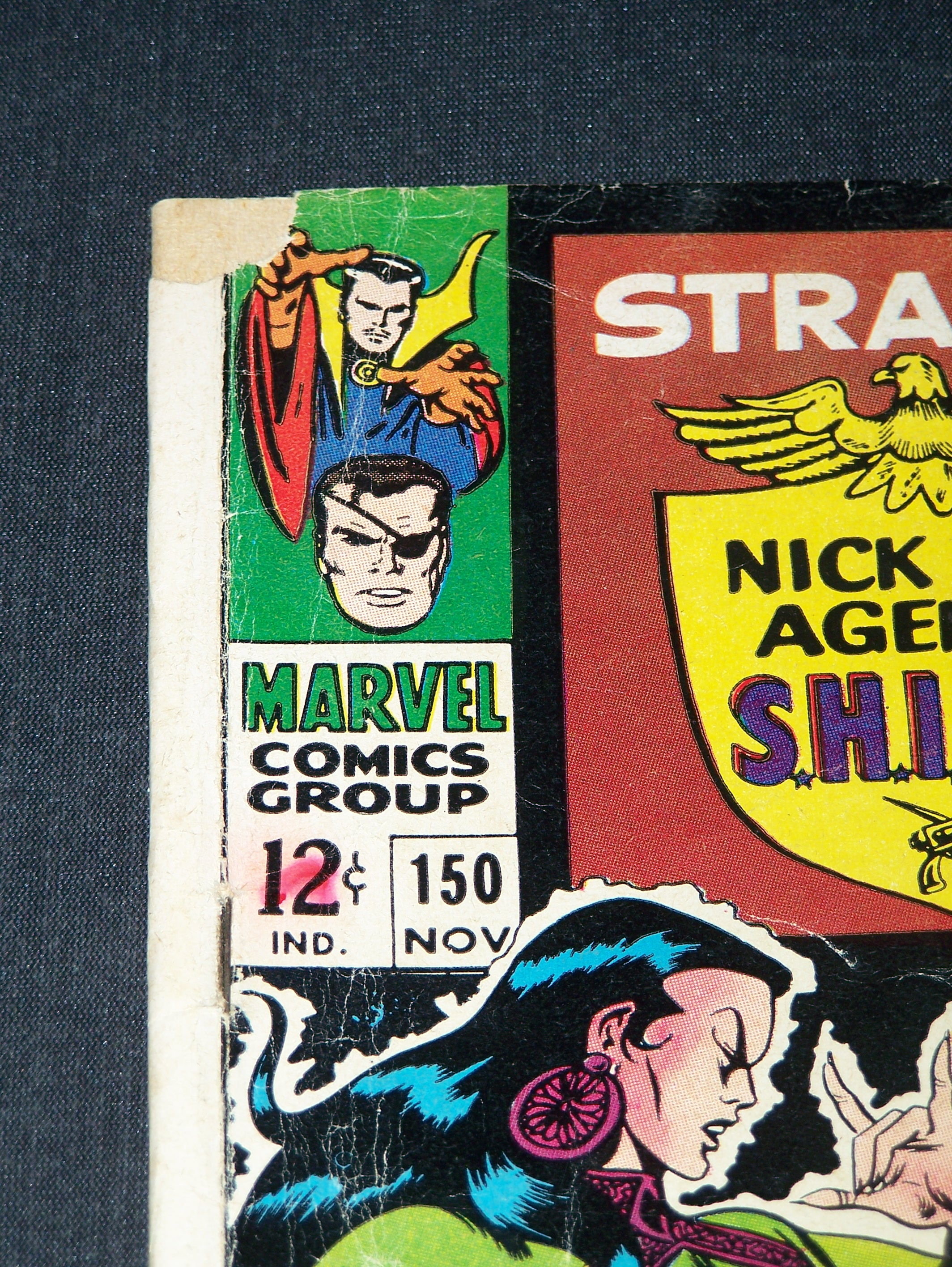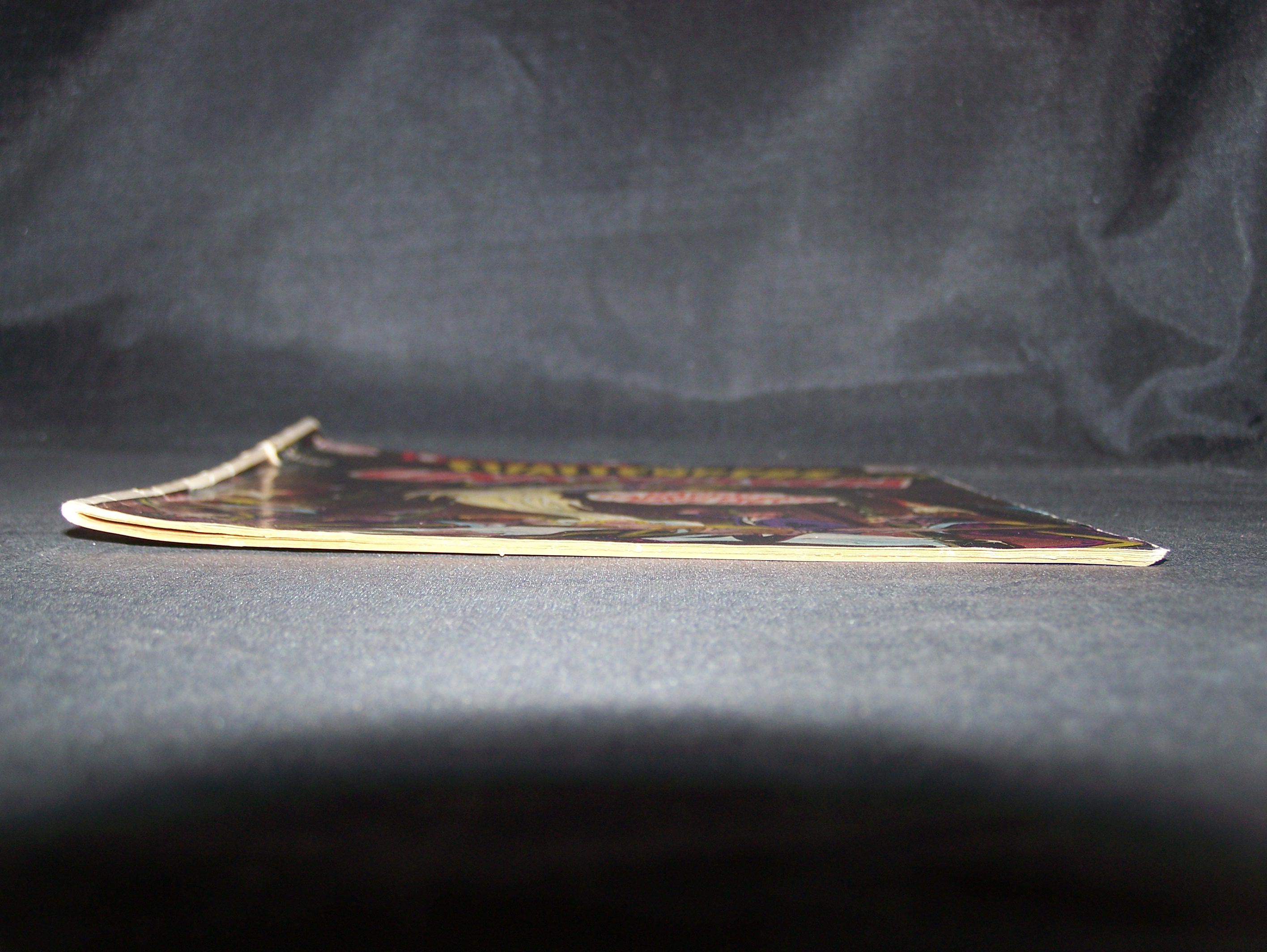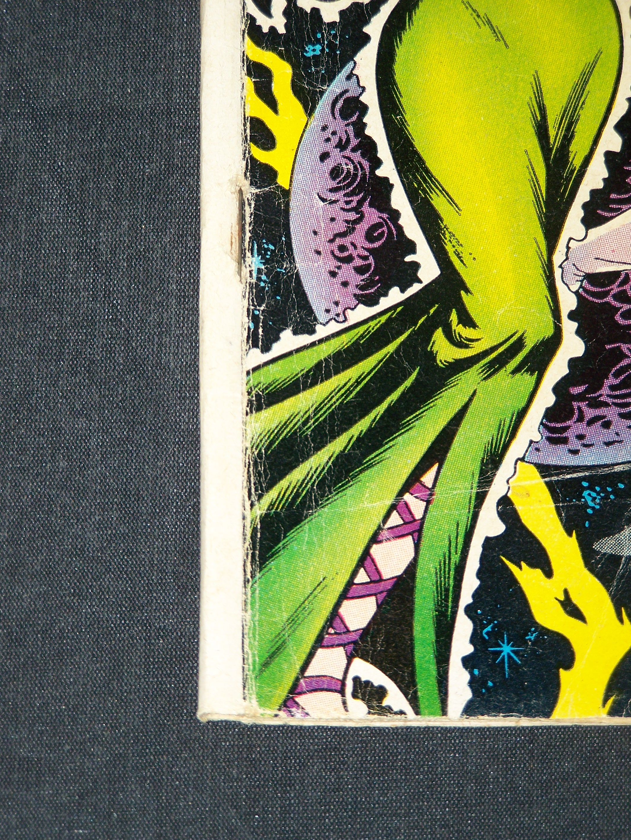 The second book in this pressing example is Strange Tales issue 150. This book also has numerous problems including a 1/4″ spine roll, missing piece from the upper left corner of the cover, red ink stain on the price, red ink stain on the back cover, a missing centerfold page, along with many creases and fold.