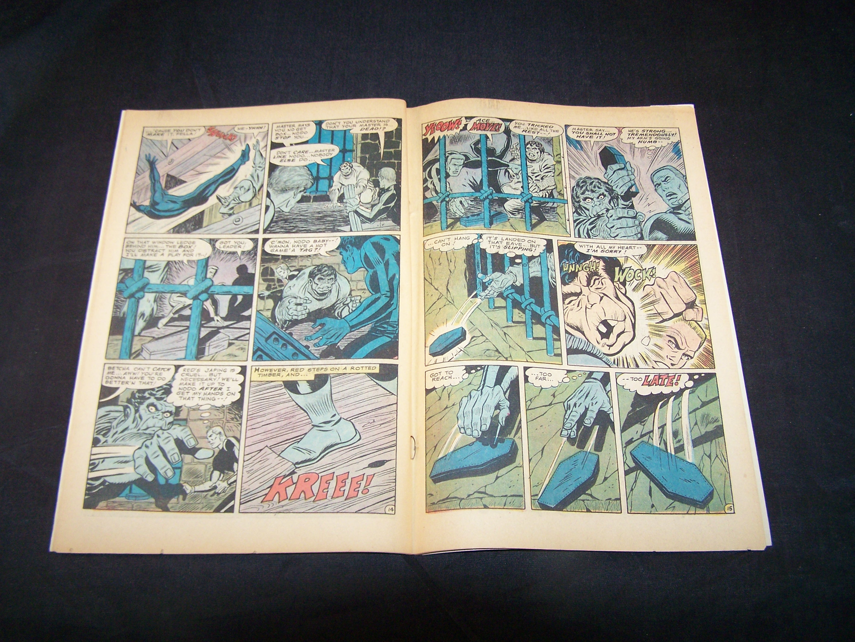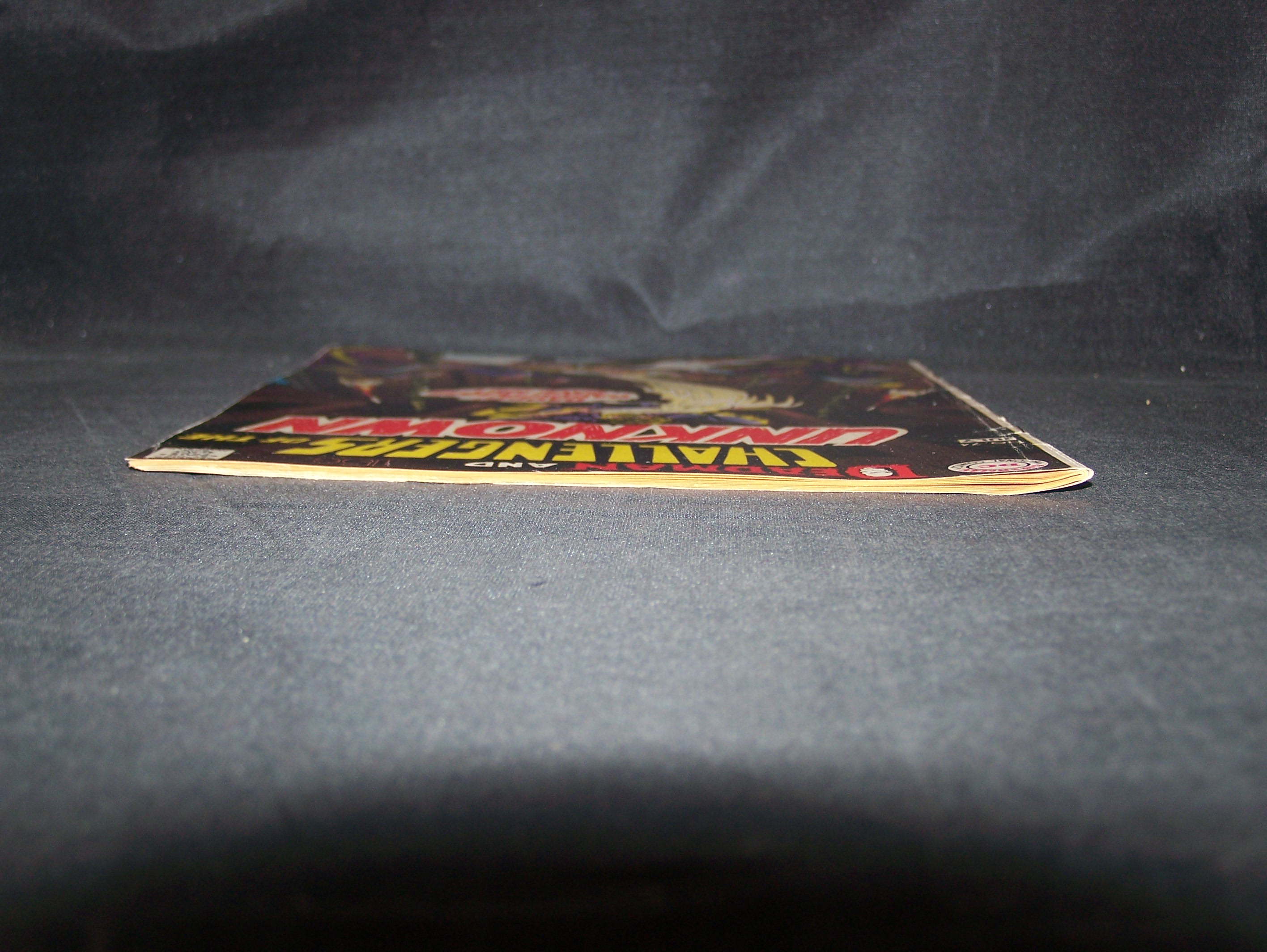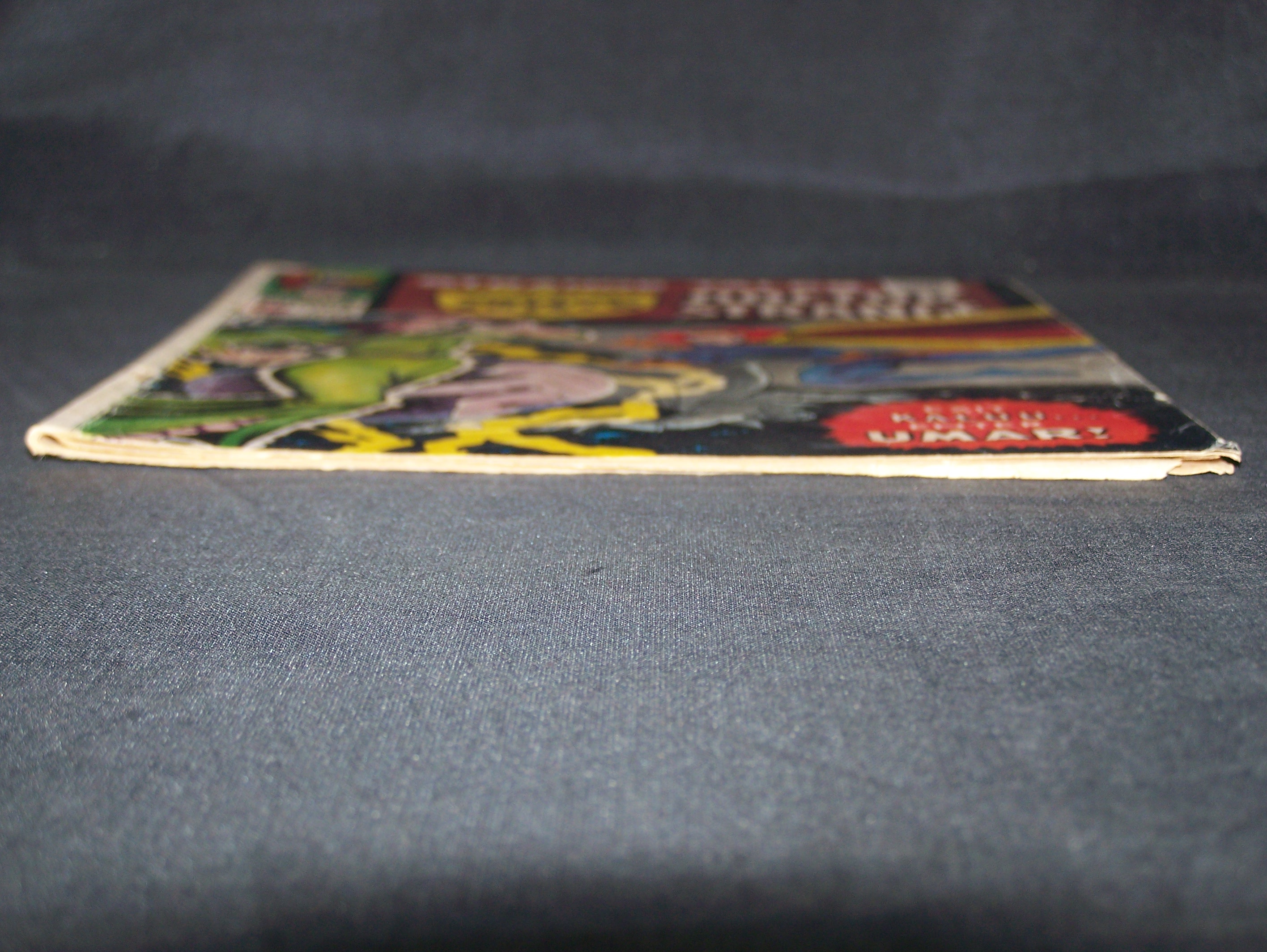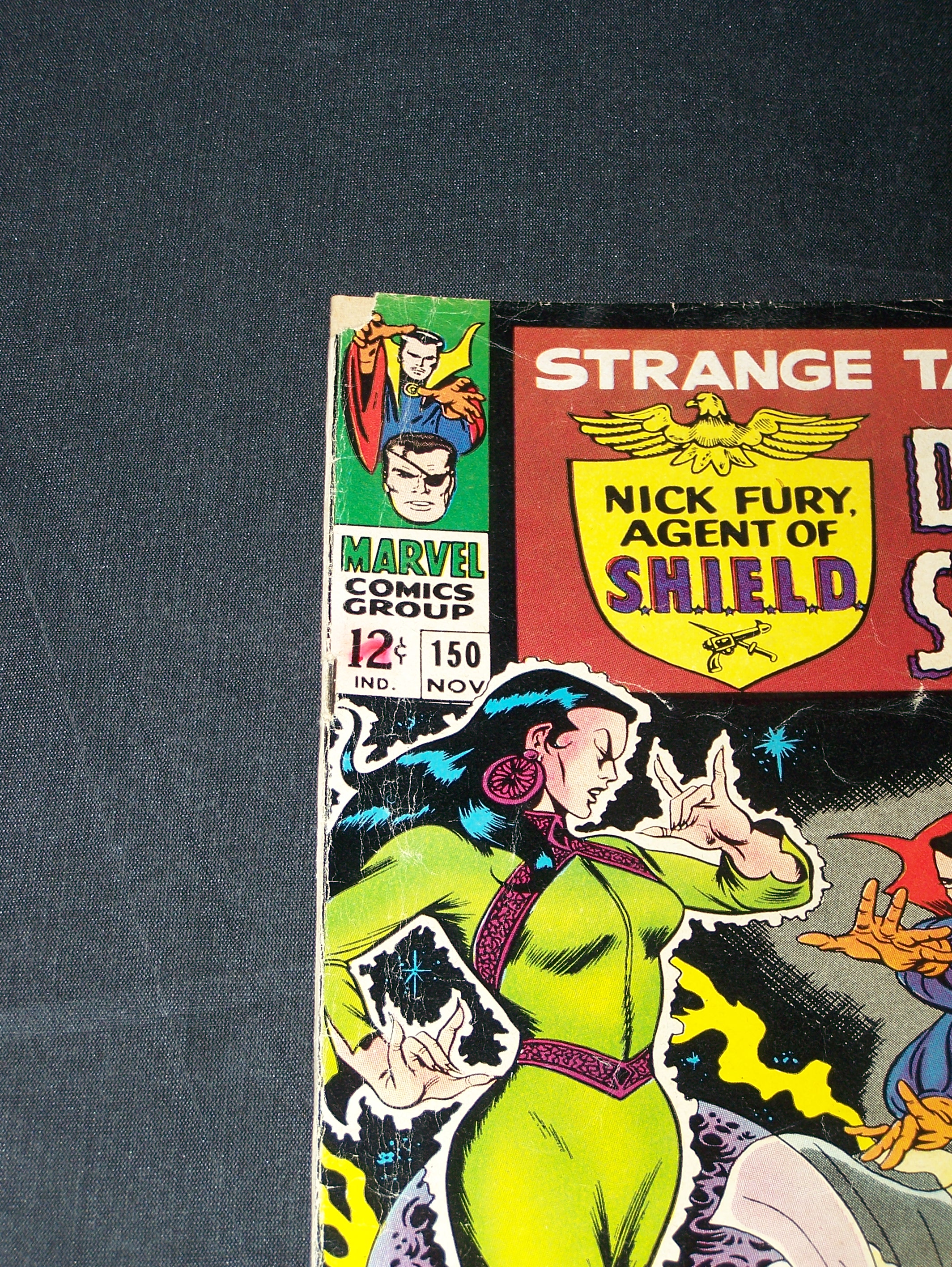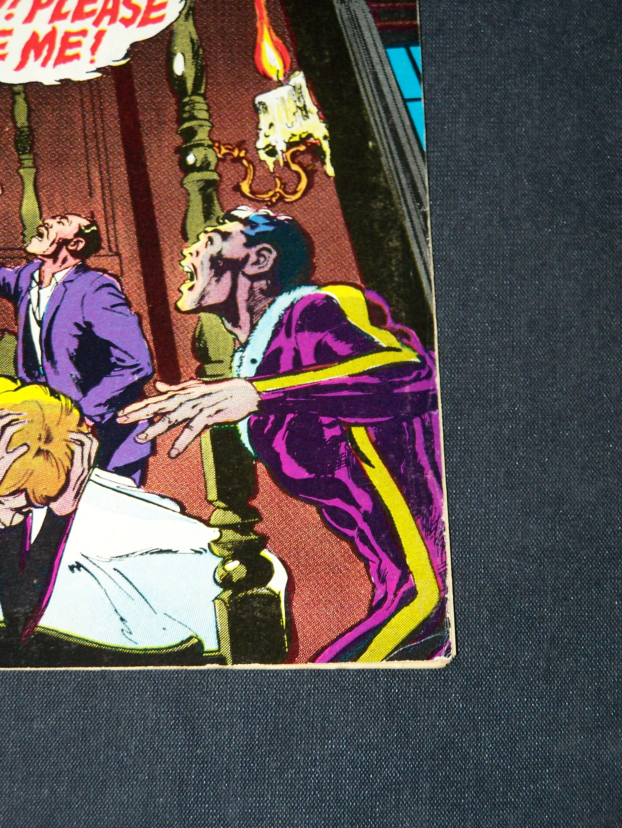 The second book in this pressing example is Strange Tales issue 150. This book also has numerous problems including a 1/4″ spine roll, missing piece from the upper left corner of the cover, red ink stain on the price, red ink stain on the back cover, a missing centerfold page, along with many creases and fold.