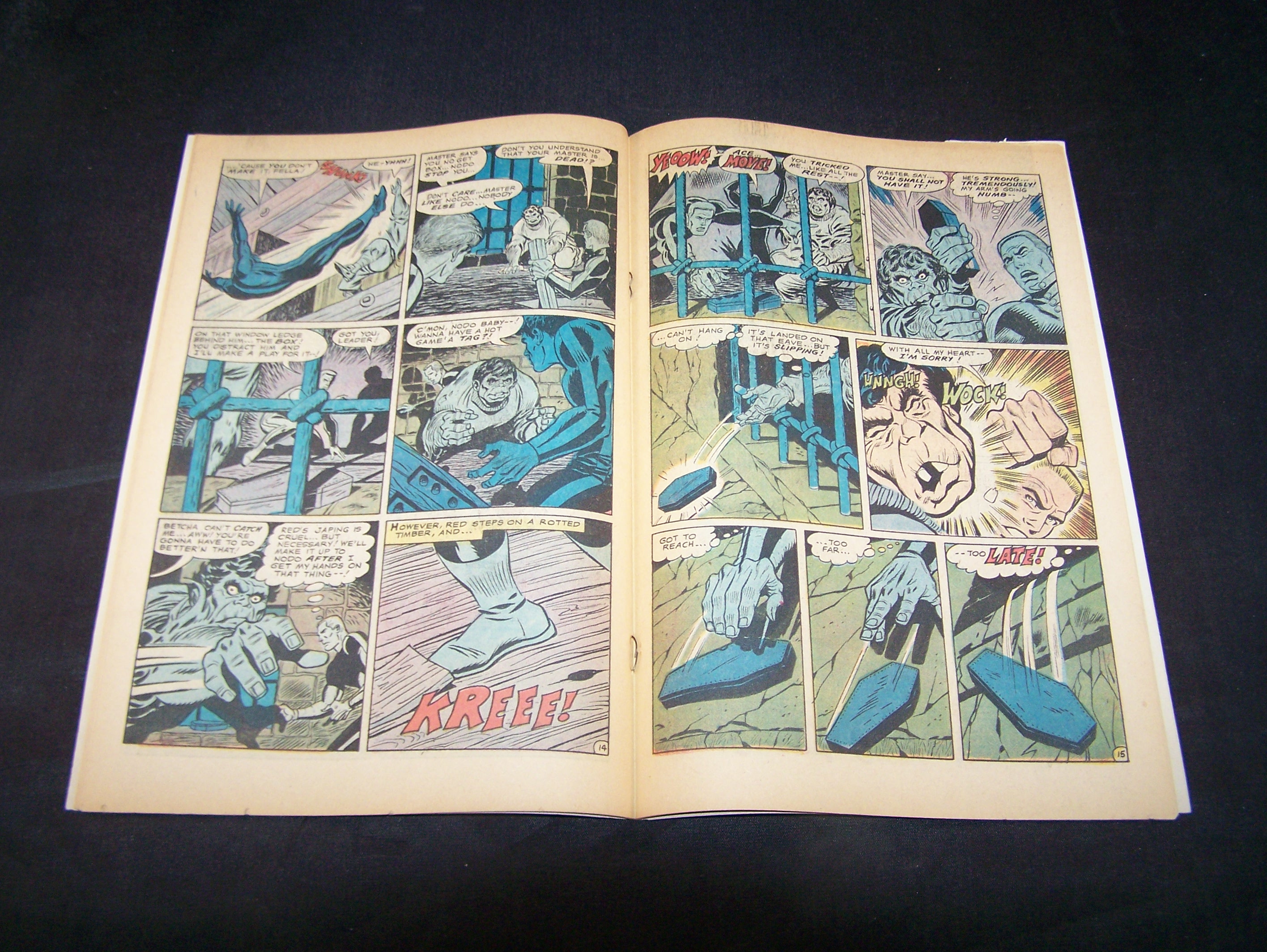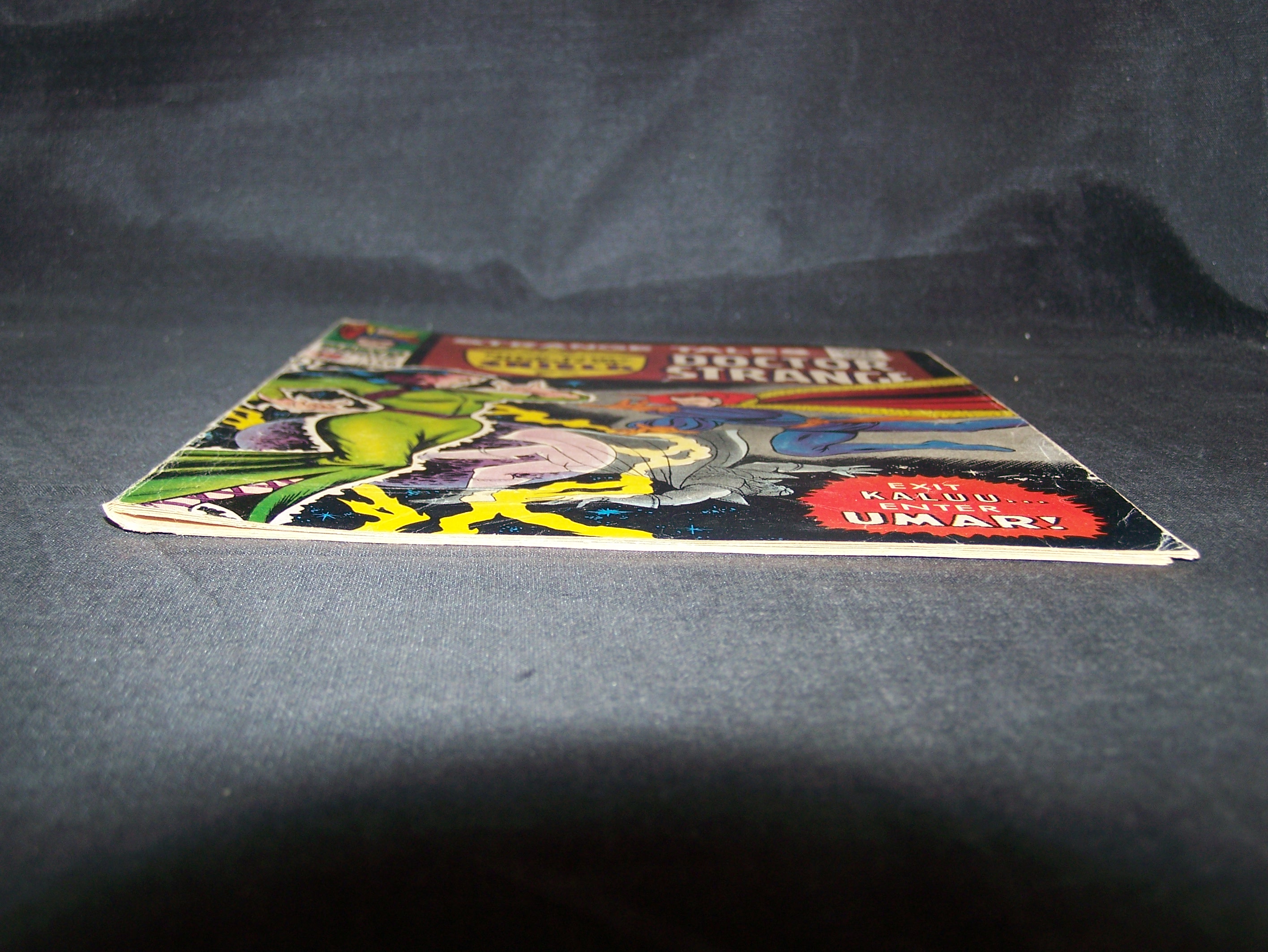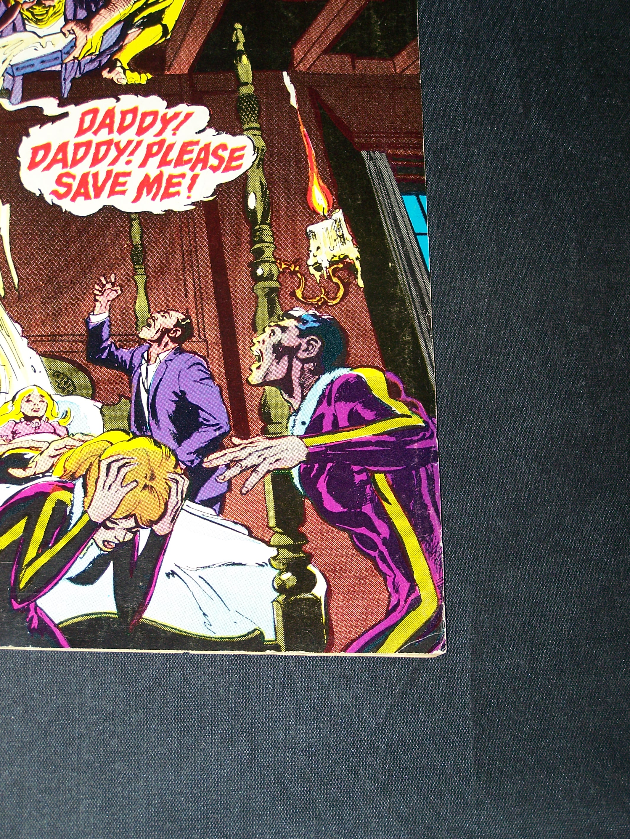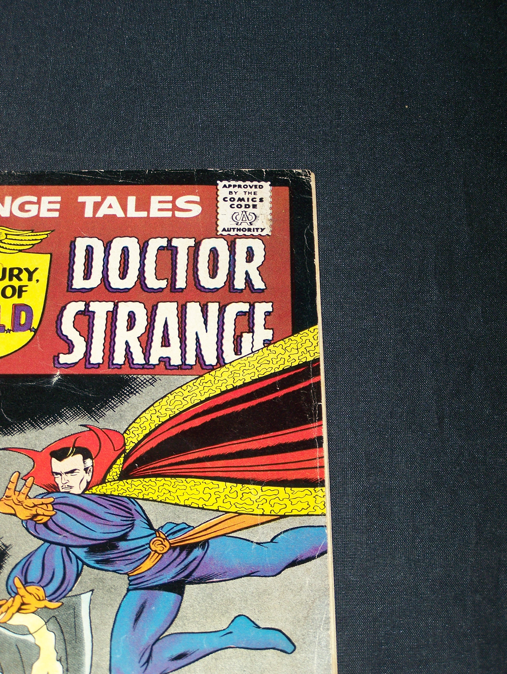 The second book in this pressing example is Strange Tales issue 150. This book also has numerous problems including a 1/4″ spine roll, missing piece from the upper left corner of the cover, red ink stain on the price, red ink stain on the back cover, a missing centerfold page, along with many creases and fold.