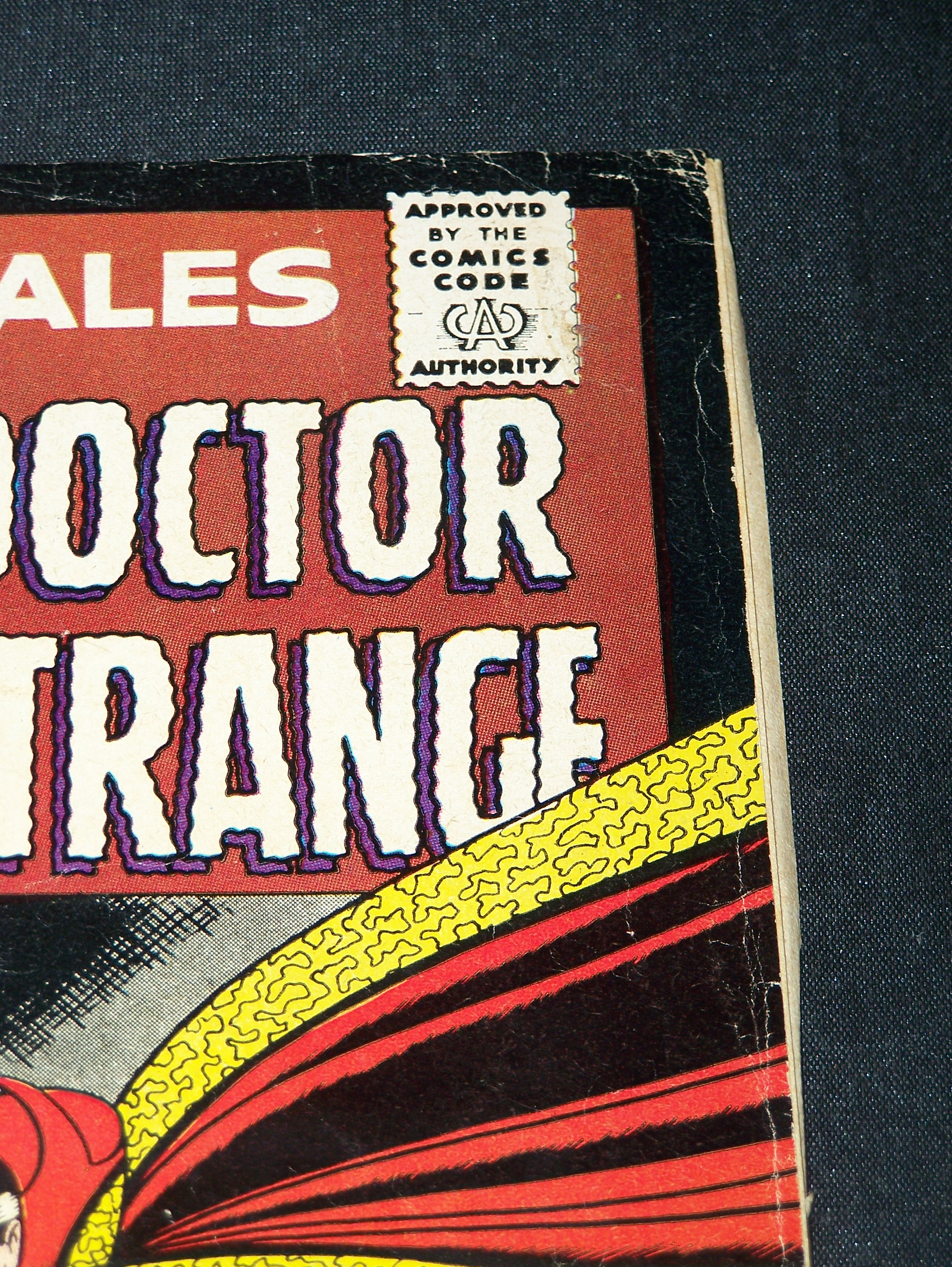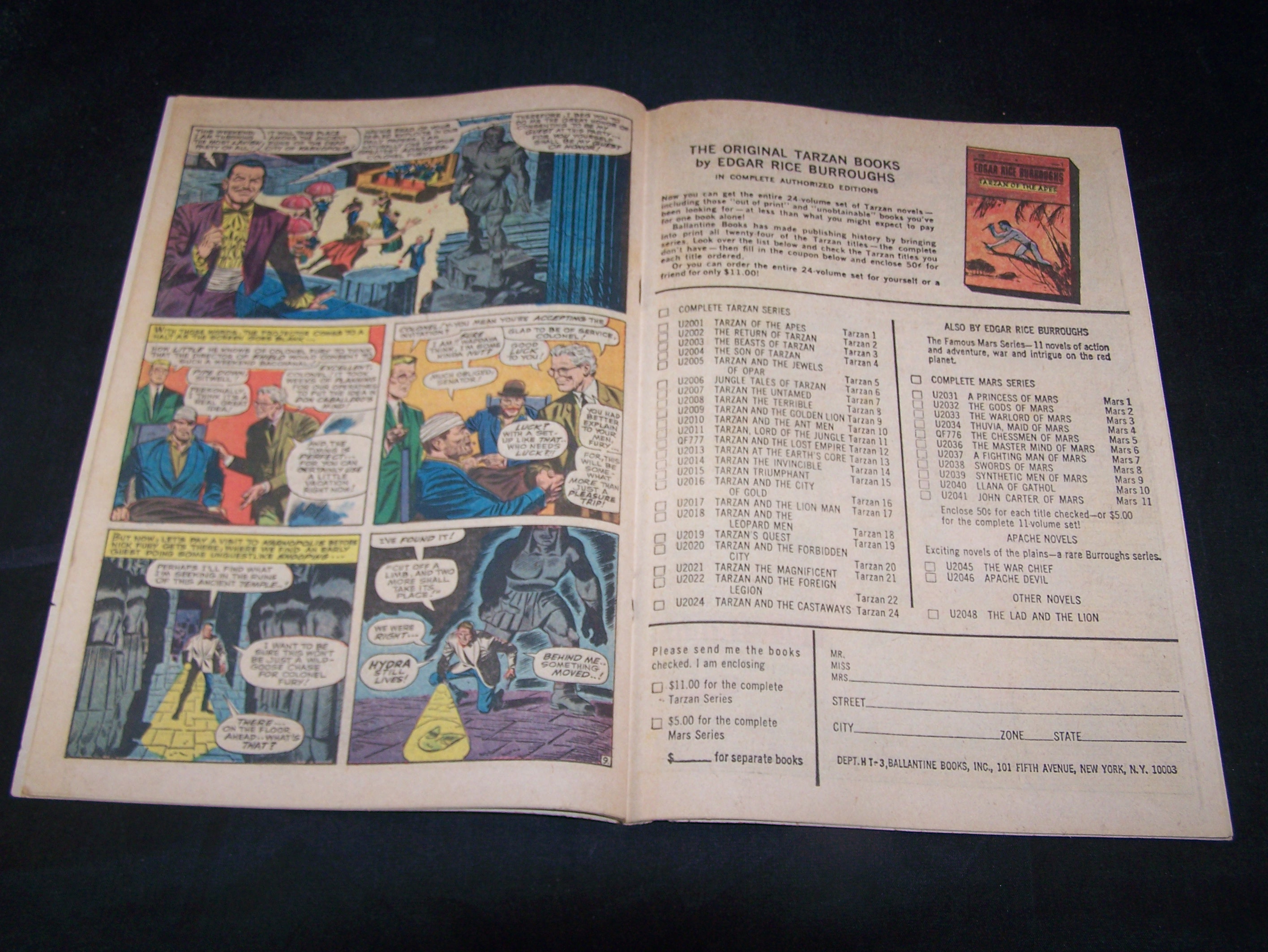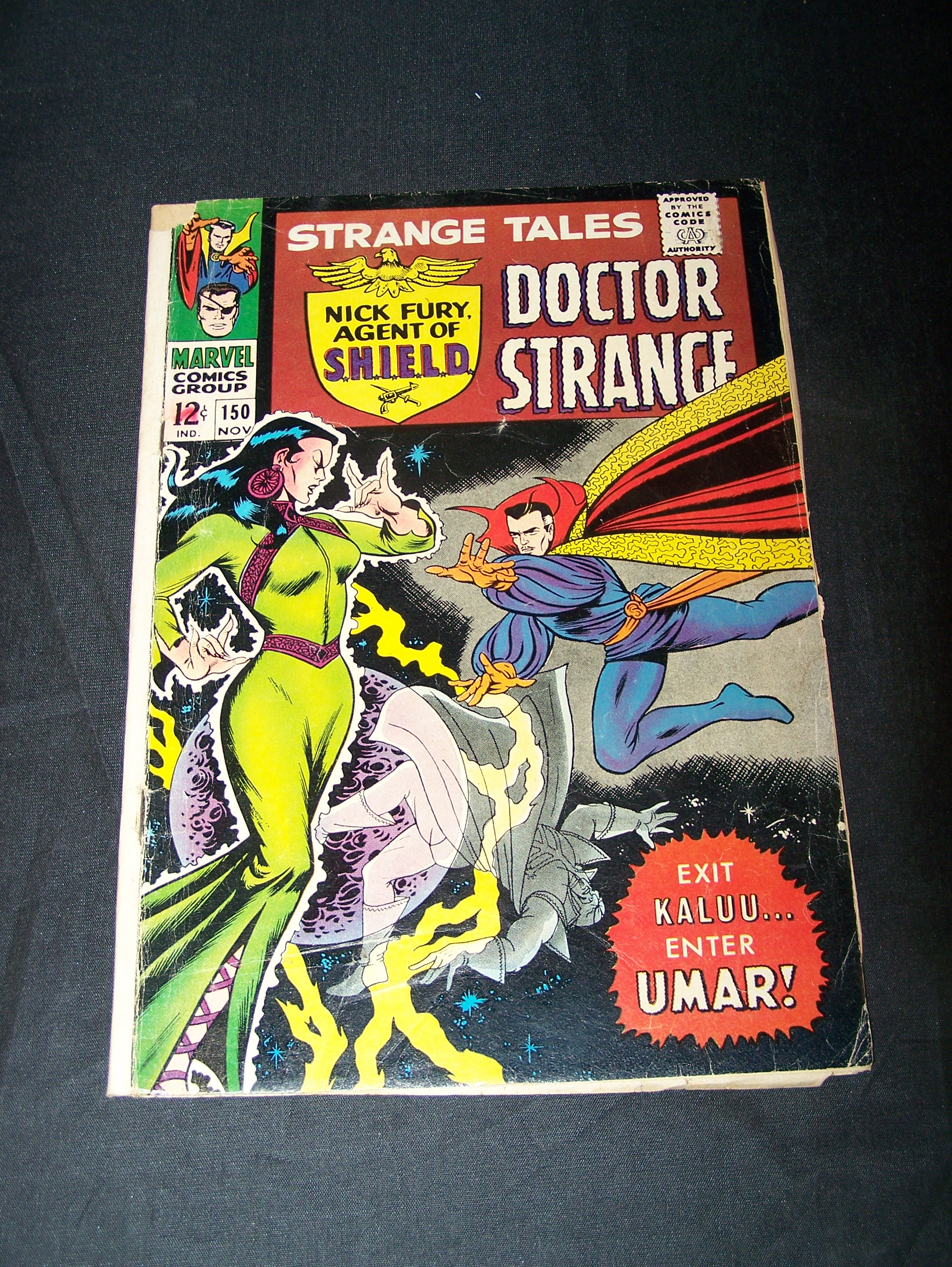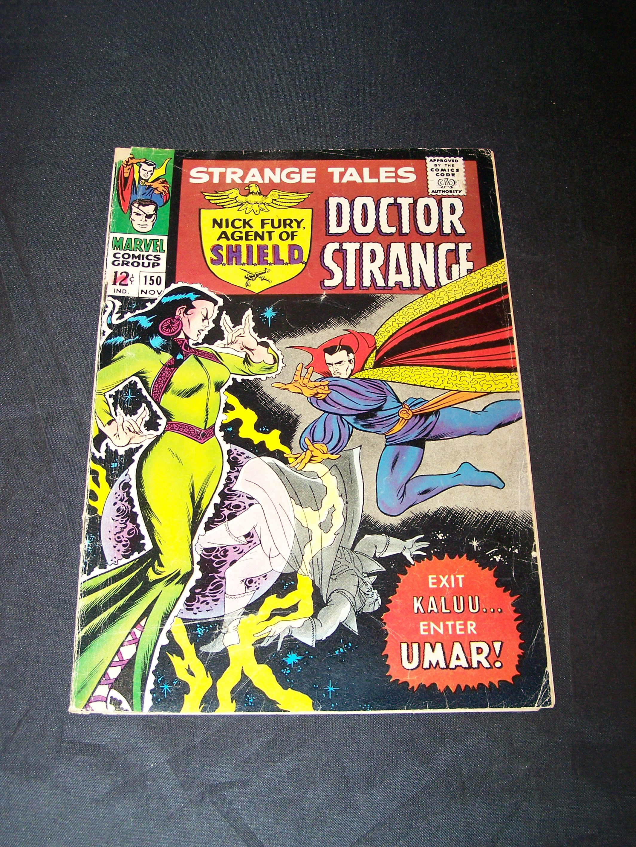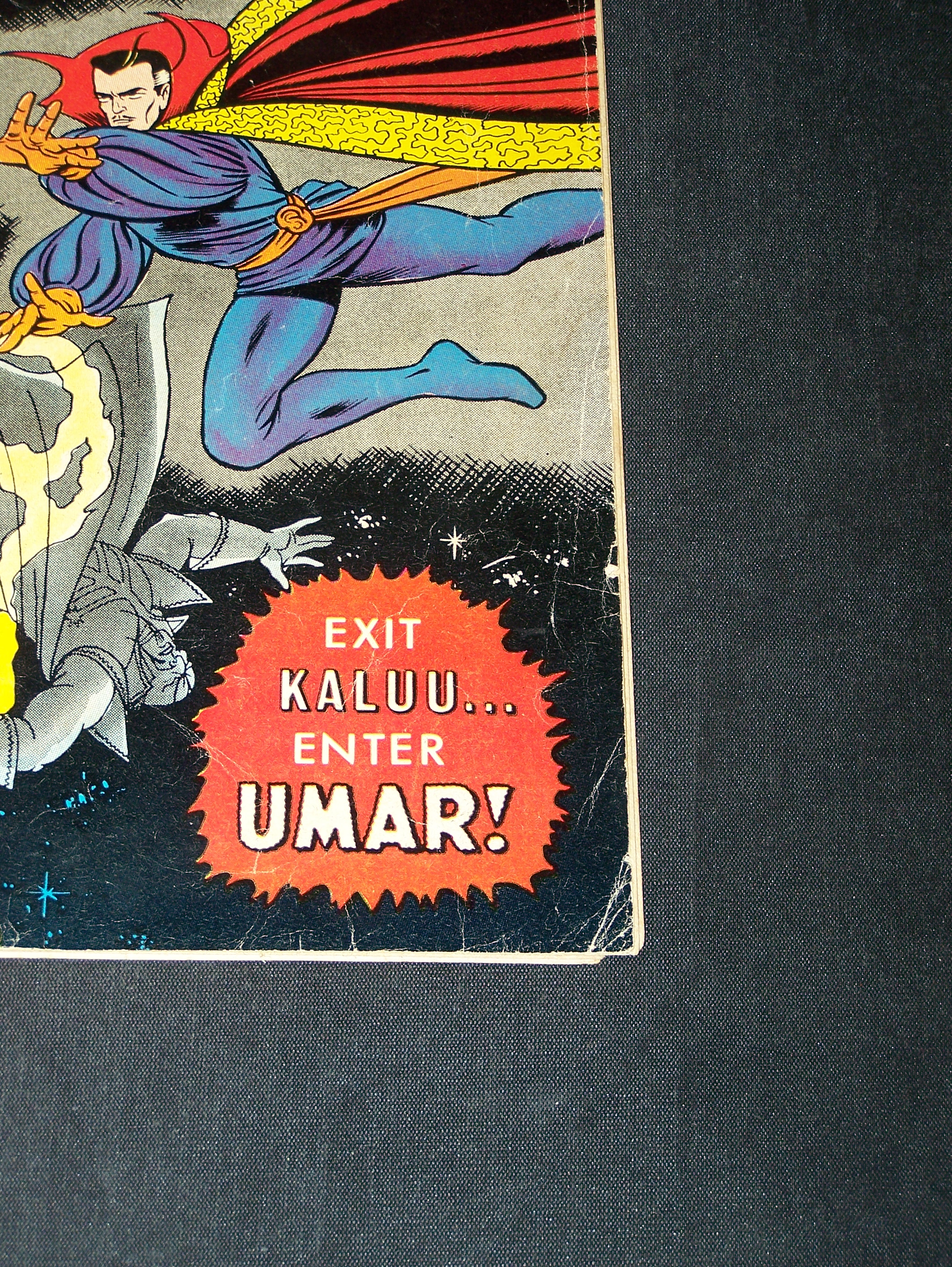 The second book in this pressing example is Strange Tales issue 150. This book also has numerous problems including a 1/4″ spine roll, missing piece from the upper left corner of the cover, red ink stain on the price, red ink stain on the back cover, a missing centerfold page, along with many creases and fold.