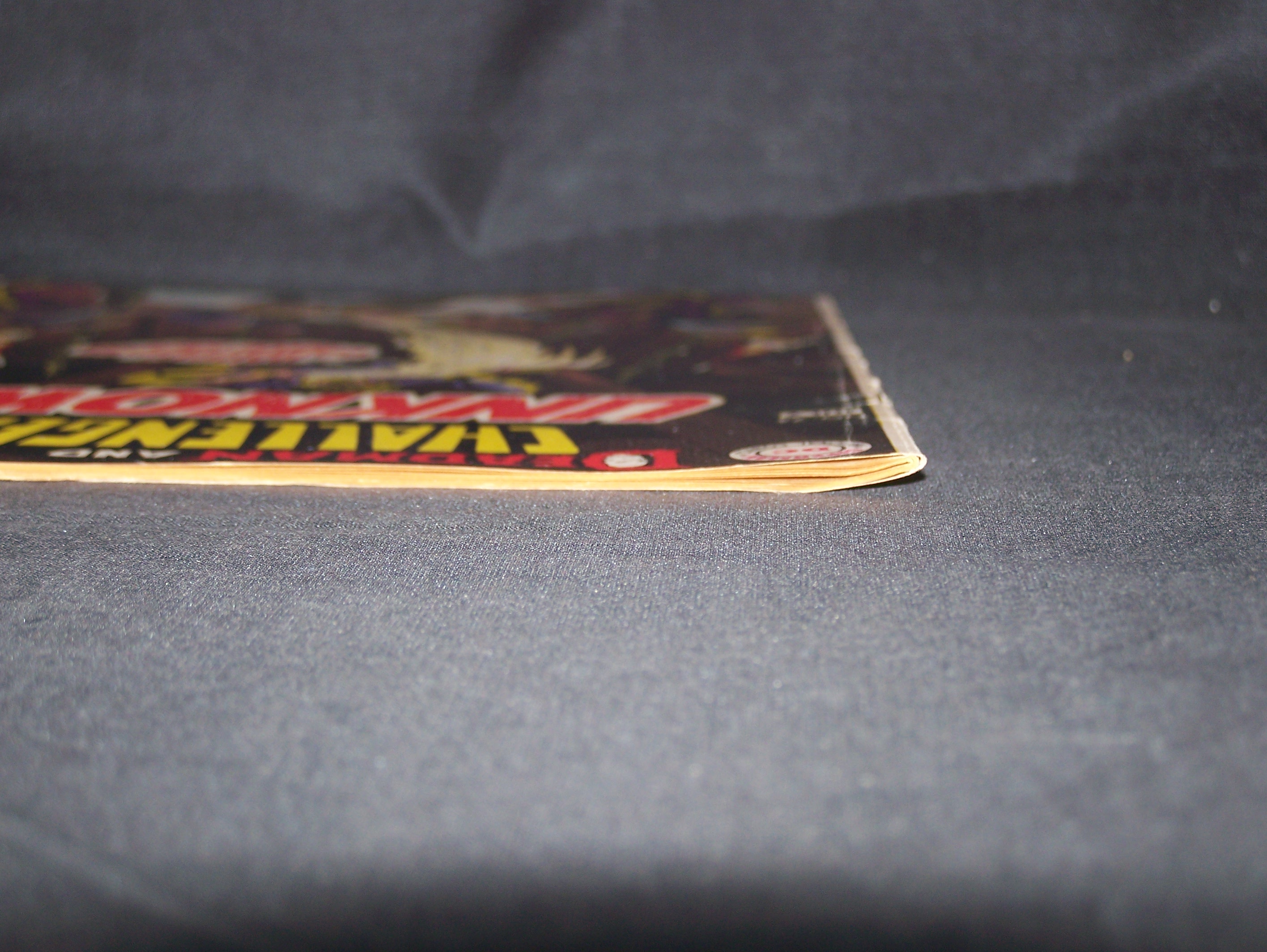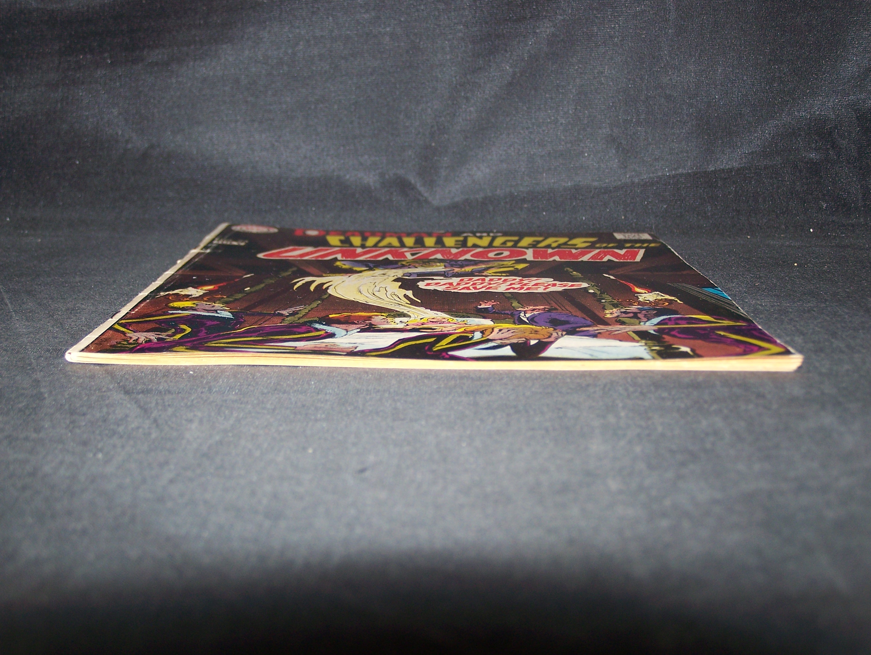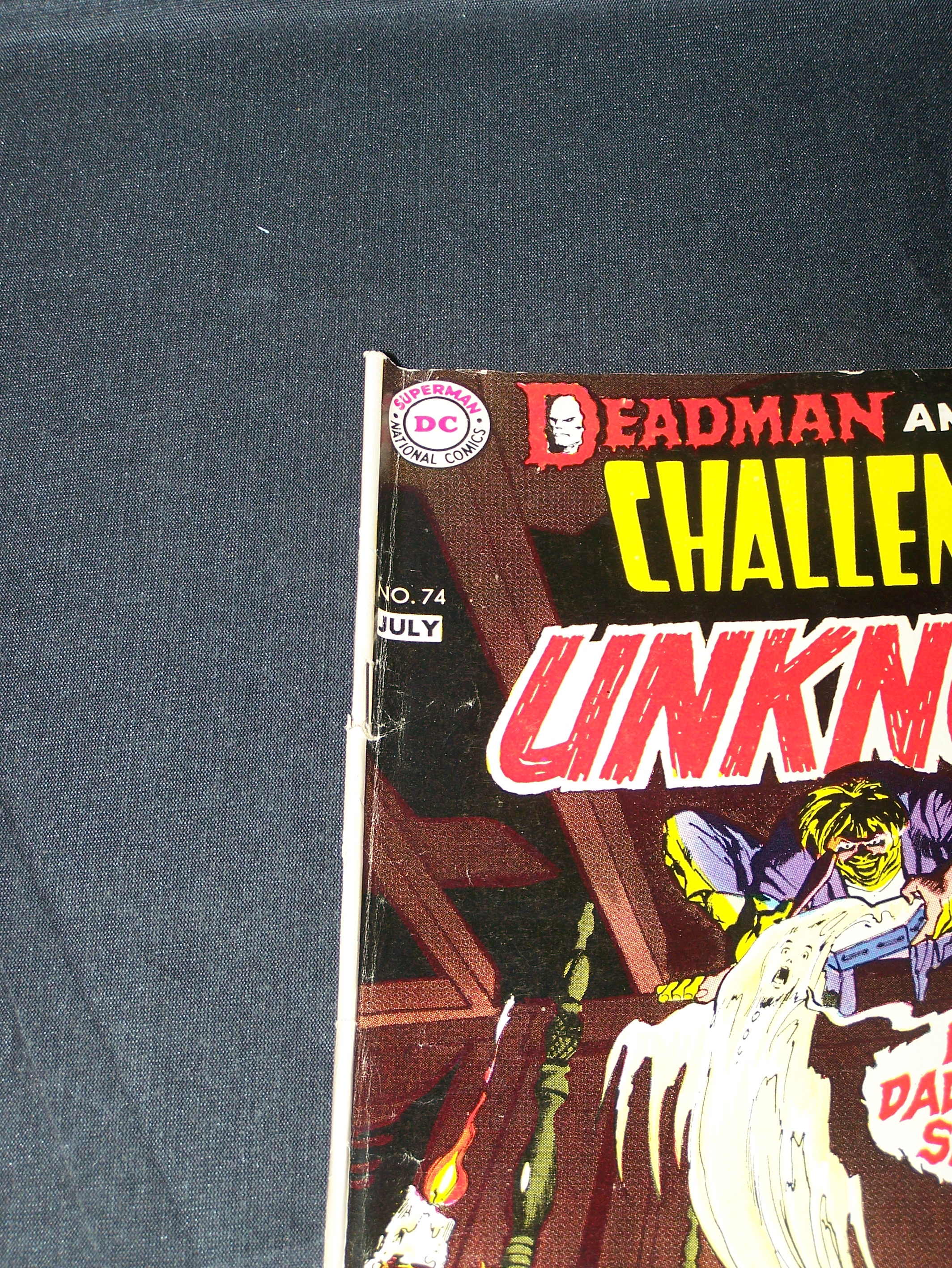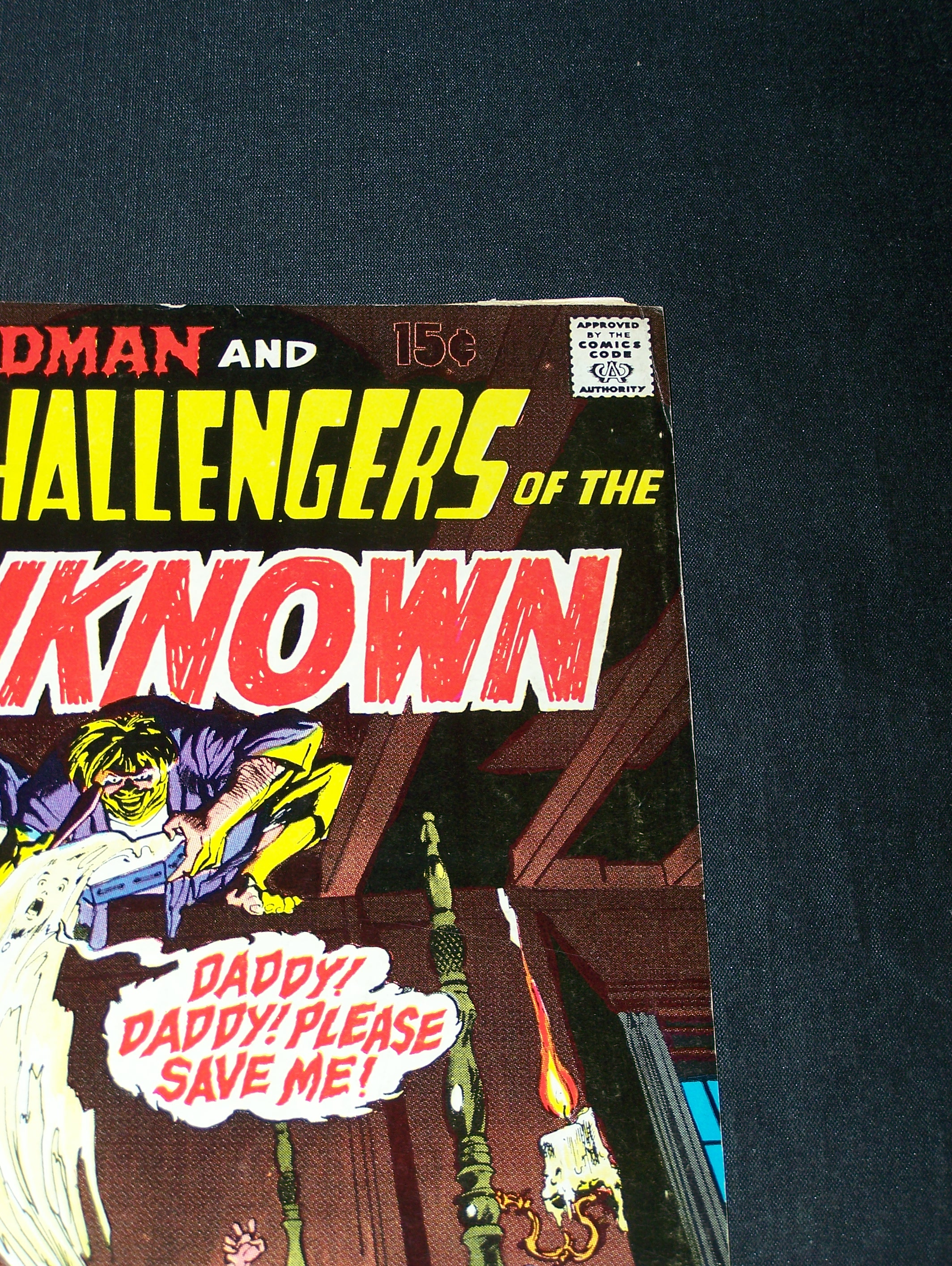 Book one is the Challengers of the Unknown issue 74. This book has numerous problems as you can see from the following images. The flaws include a spine roll and a hard crease down the upper left edge of the book. The comic does not lay flat, has tears around the staples. However, the cover is still attached at both staples and the centerfold is also attached at both staples. You can check the following images to get an idea of how the book looked prior to the press.