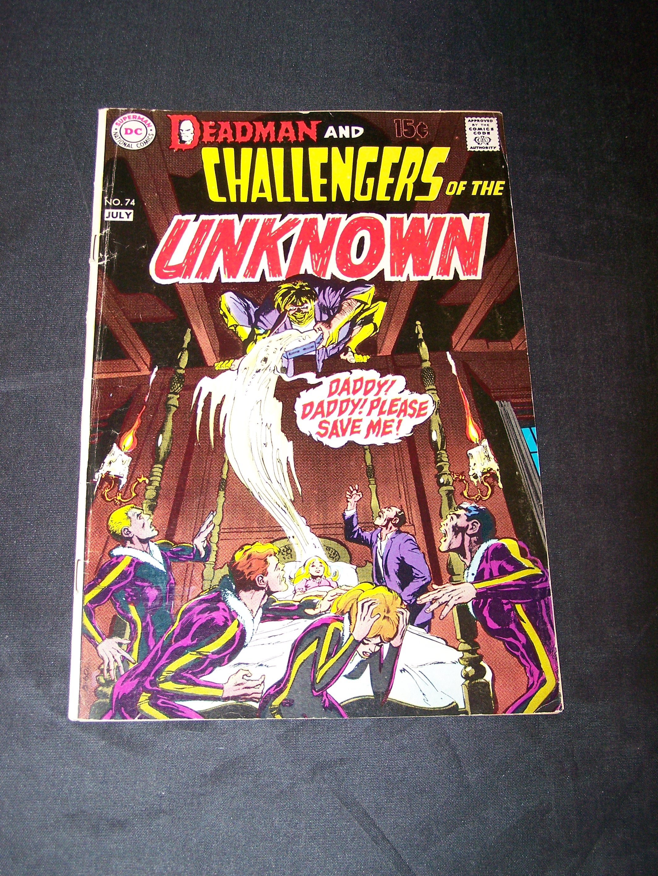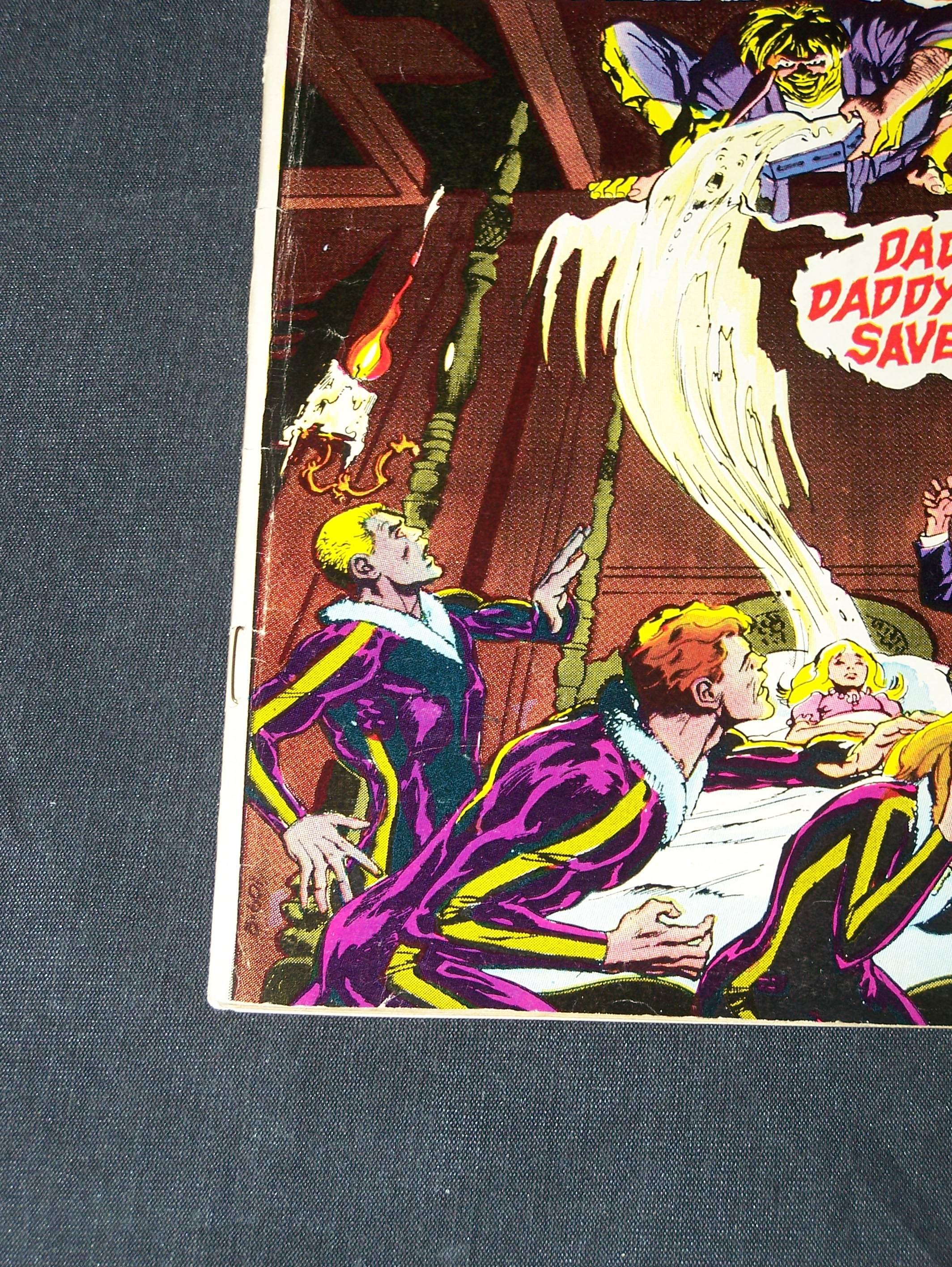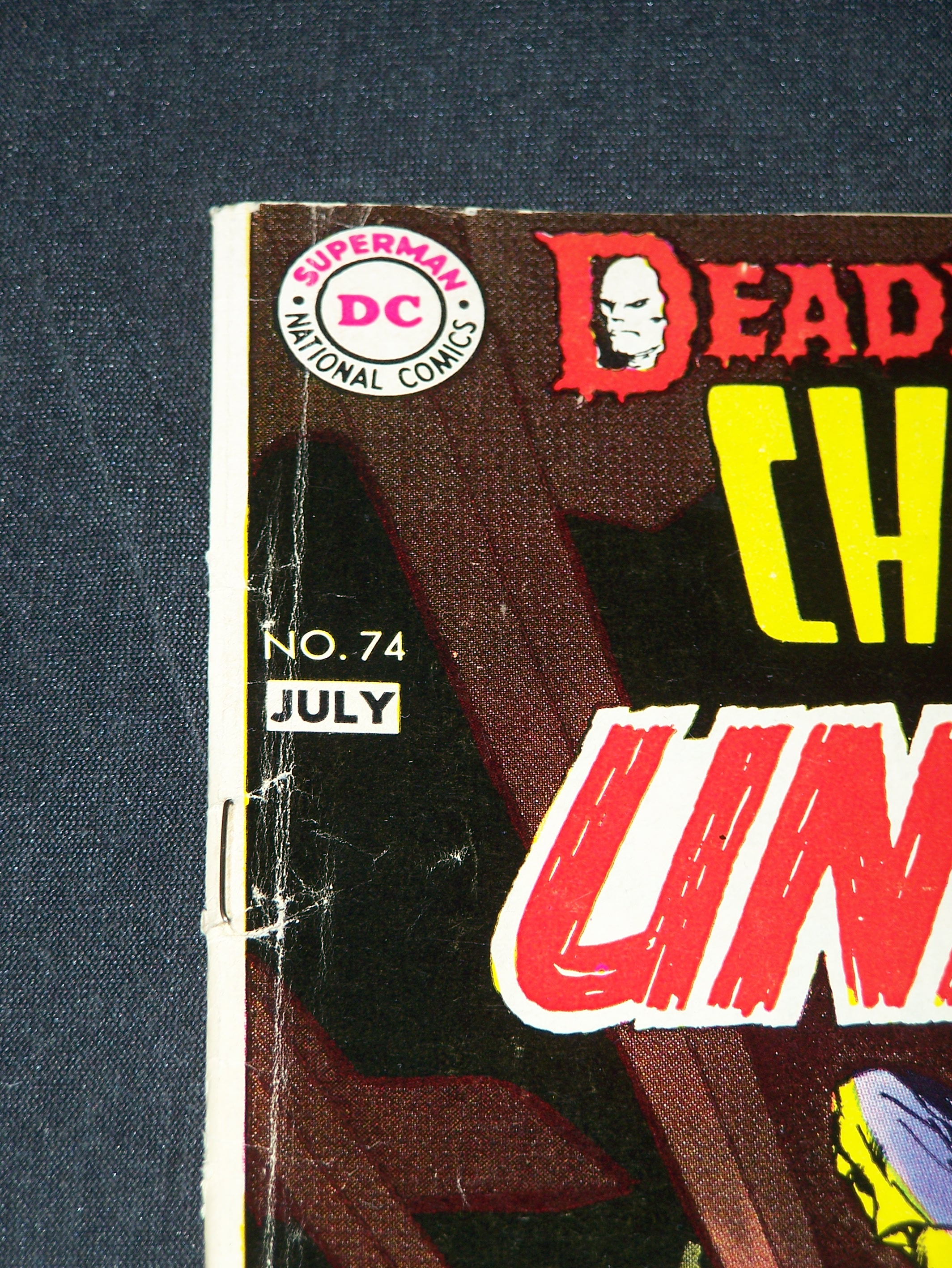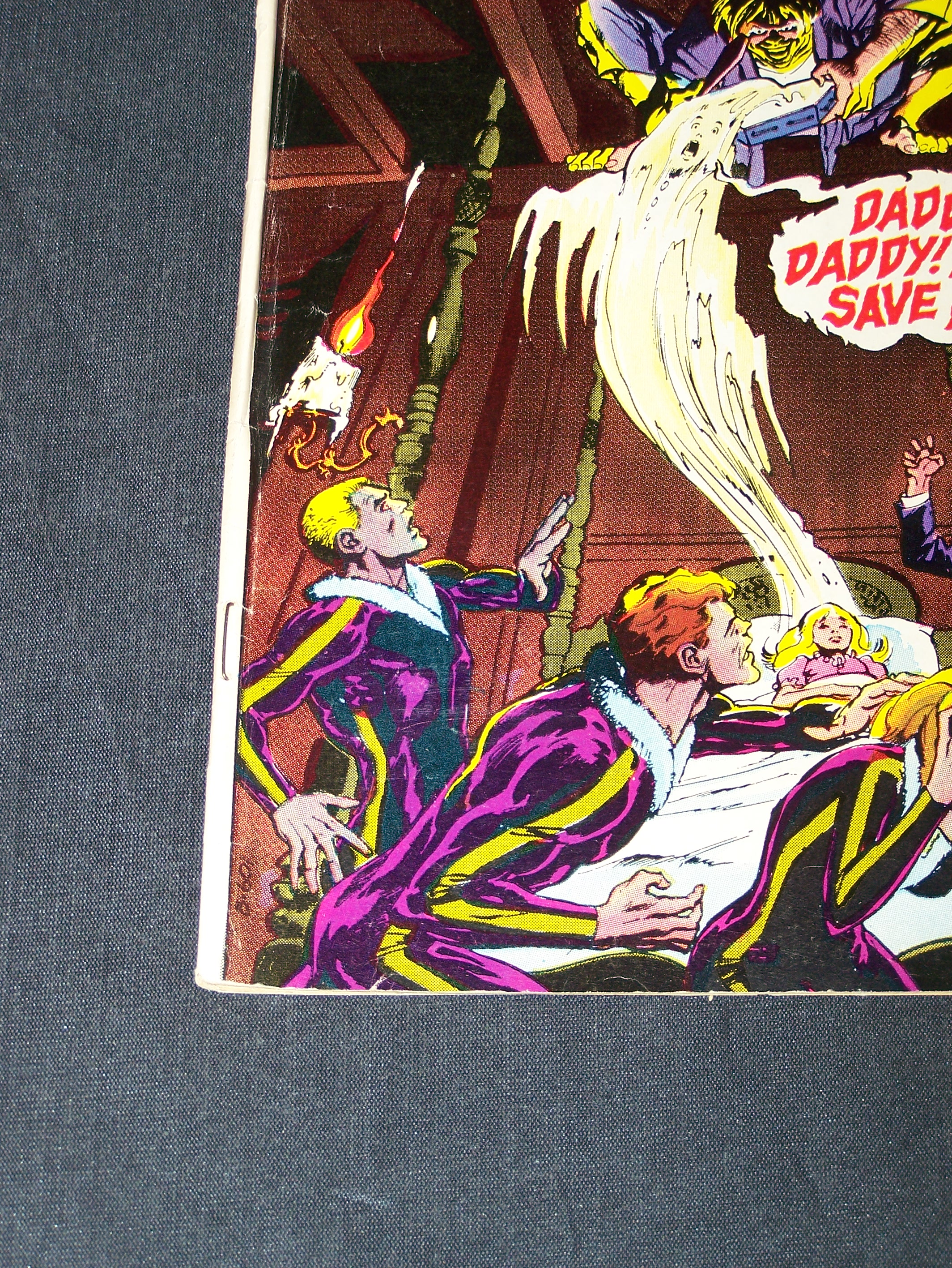Book one is the Challengers of the Unknown issue 74. This book has numerous problems as you can see from the following images. The flaws include a spine roll and a hard crease down the upper left edge of the book. The comic does not lay flat, has tears around the staples. However, the cover is still attached at both staples and the centerfold is also attached at both staples. You can check the following images to get an idea of how the book looked prior to the press.