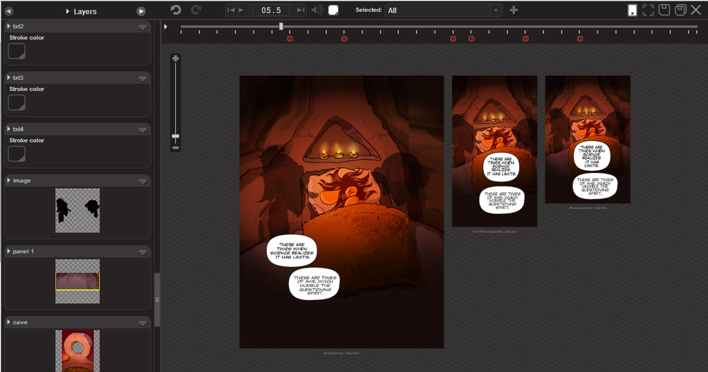 Naturally, my first try on the medium was the "pimped comics" approach: I designed the comic as I would for print, panels and all, and then figured a way to enhance each panel with motion gizmos.