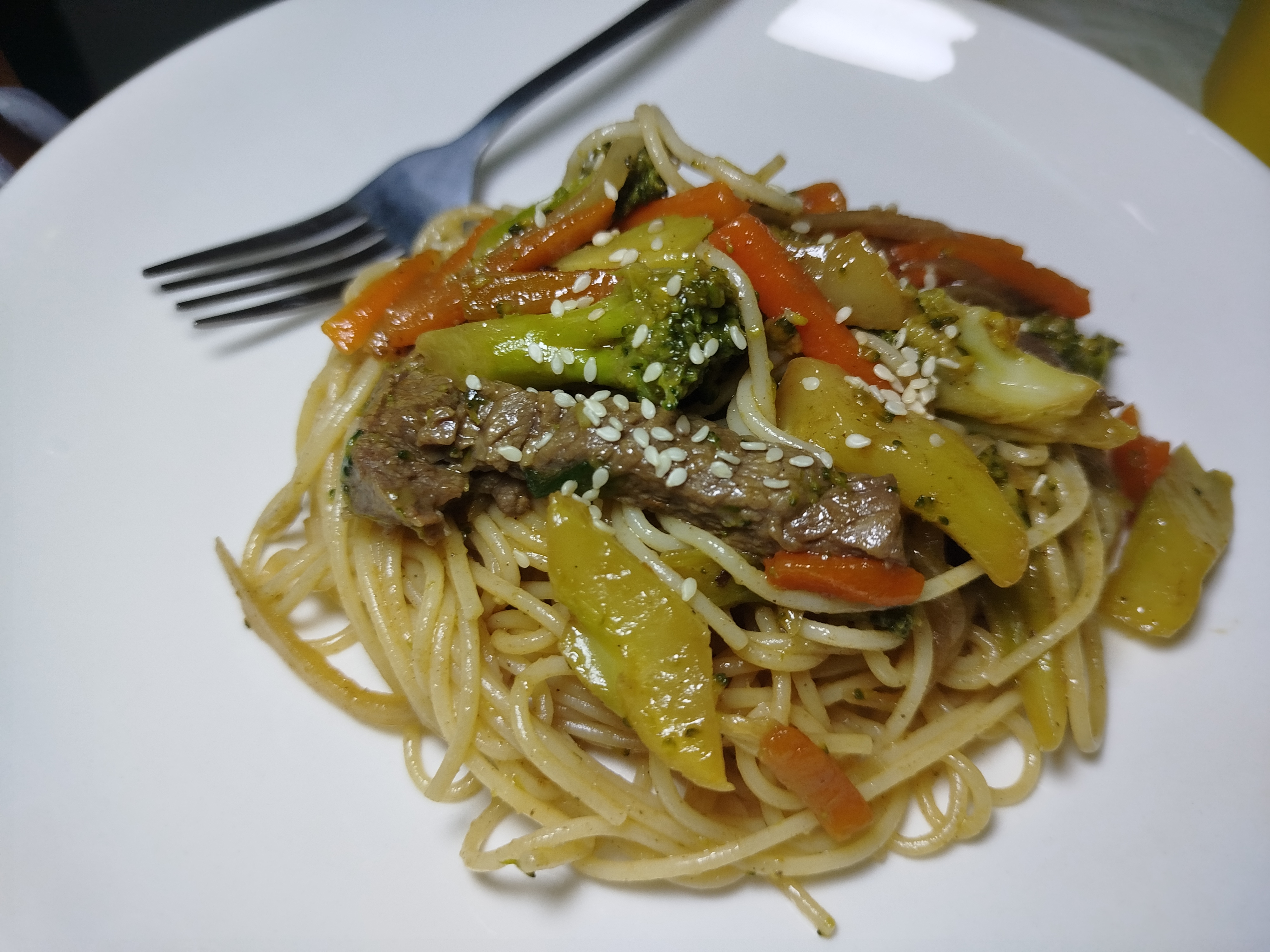 Llegué justo a la hora de preparar el almuerzo, la verdad yo había quedado algo cansada pero tenía malestar aun y bueno después de descansar me puse a cocinar y como ya tenía todo planeado no tuve que pensar en lo que cocinaría, así que hice una carne con vegetales y una pasta, a la carne y vegetales le puse salsa de ostras y junte todo, así quedó una deliciosa pasta con carne y vegetales, algo como una pasta china y si quedo bastante rica.