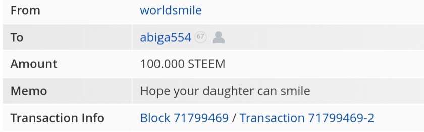 Thank you for this notification, I will send a donation of 100 Steem through the World smile Project, hopefully the daughter of @abiga554 can smile again