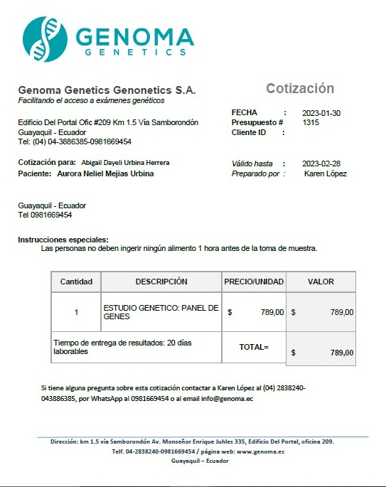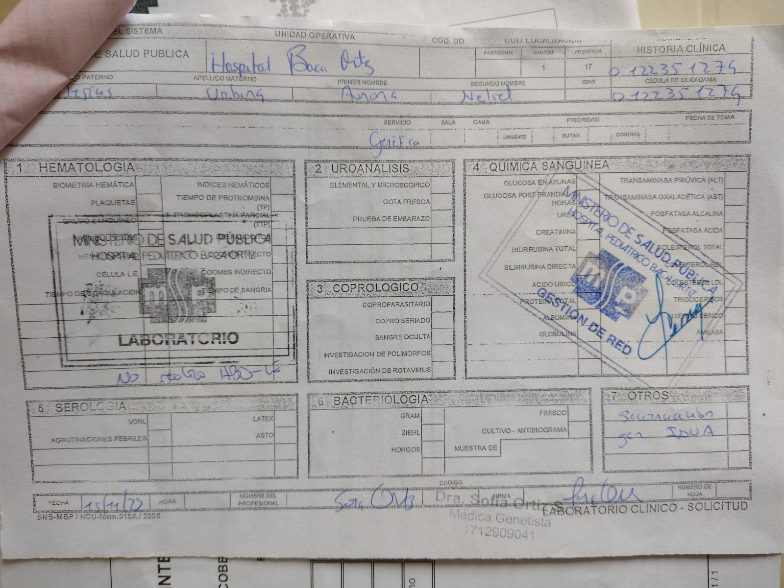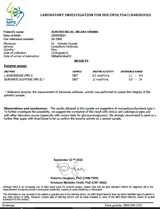 Apenas recibí ese resultado le pedí ayuda al doctor, ya que teníamos pocas semanas que llegamos a Ecuador y para obtener una cita con un genetista es complicado, el doctor me ayudó con un contacto y enseguida comenzaron todos los análisis correspondientes, ya la han visto varios especialistas como: El Oftalmólogo, Otorrinolaringólogo, Cardiólogo, Gastroenterólogo, Hepatólogo, Neumologo y NeurólogoGracias a Dios la enfermedad no ha avanzado, solamente se encuentra en el hígado, la genetista me dió la mala noticia de que no existe tratamiento en el Ecuador, para ella poder solicitar el tratamiento debemos realizarle un examen genético que se llama Secuencia de gen IDUA.