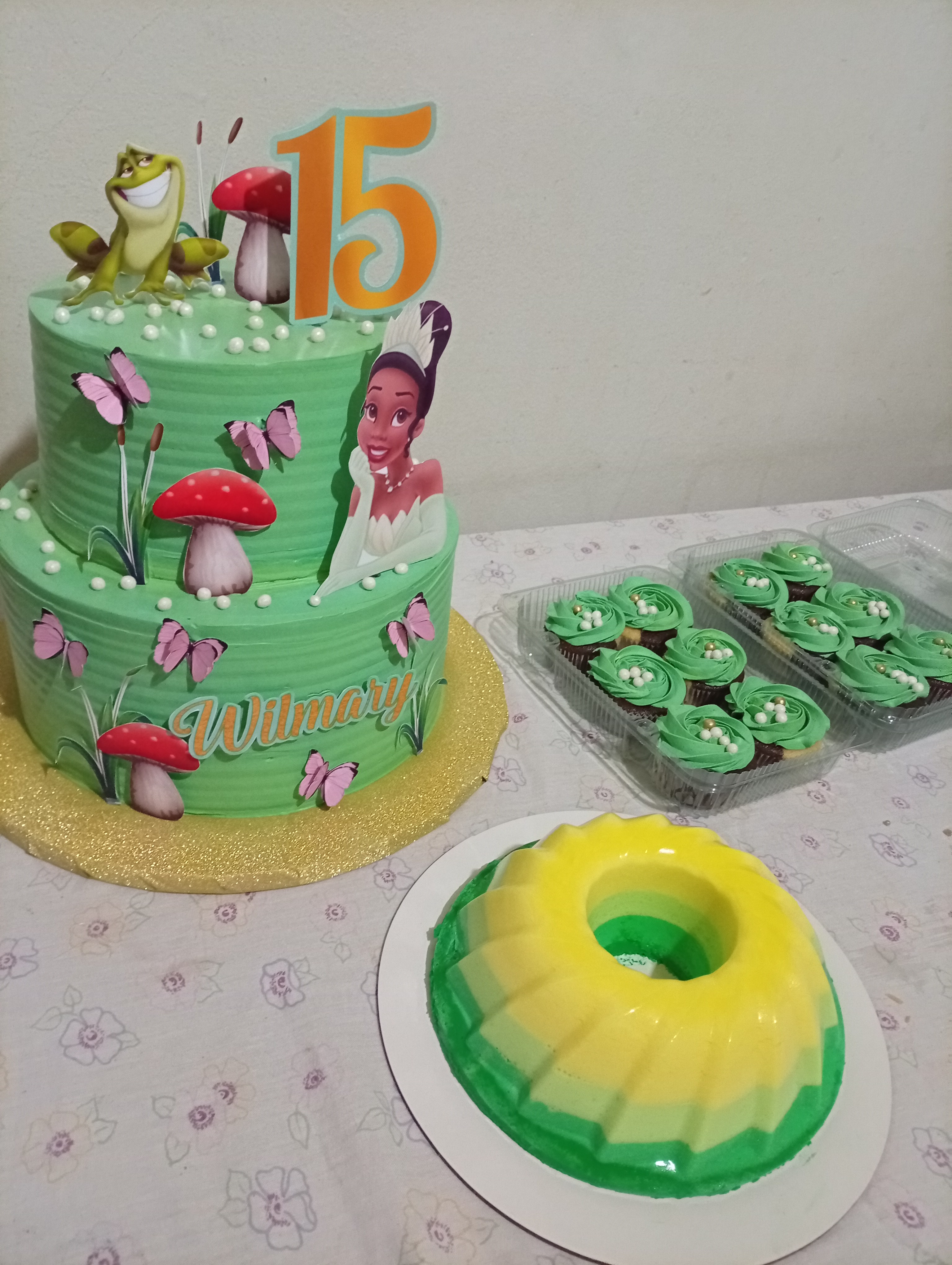 El último pedido del día fue un pastel para 15 años en temática La princesa y el sapo, fue para 40 personas, iba acompañado de una gelatina, 12 cupcakes y 20 mini-donas aunque me salieron 21, este pastel era marmoleado con relleno de chocolate así lo pidió la quinceañera y su mamita es una de mis primeras clientas desde que llegué aquí a Brasil y desde entonces se ha quedado conmigo por lo cual estoy sumamente agradecida.