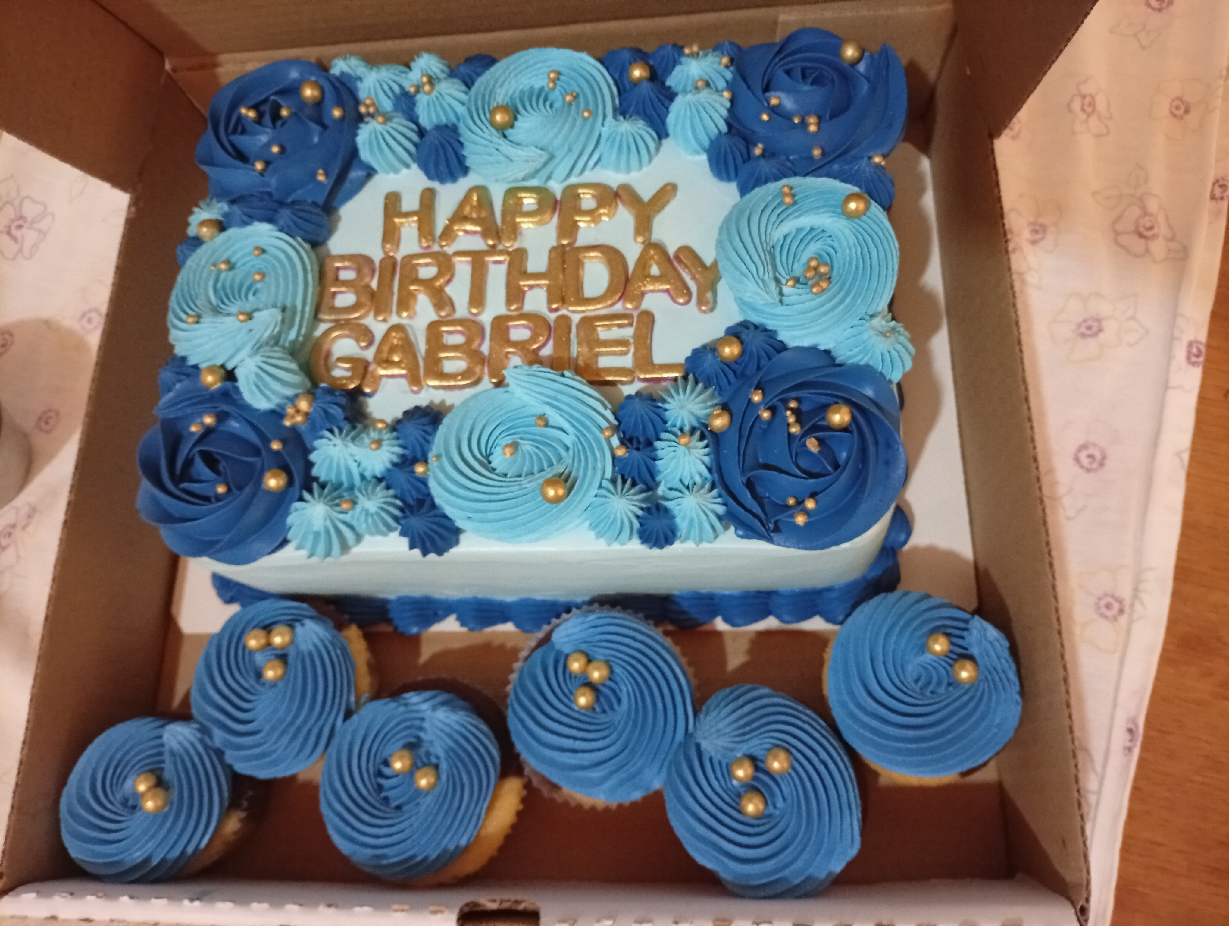 El segundo pastel del día era un pastel para caballero en decoración sencilla, en tonos azul marino y azul claro, este es un combo que ofrezco de pastel rectangular en caja con seis cupcakes, era sabor marmoleado con relleno de crema diplomática la crema diplomática es muy deliciosa y para la familia que me realizó este pedido esta es su favorita.
