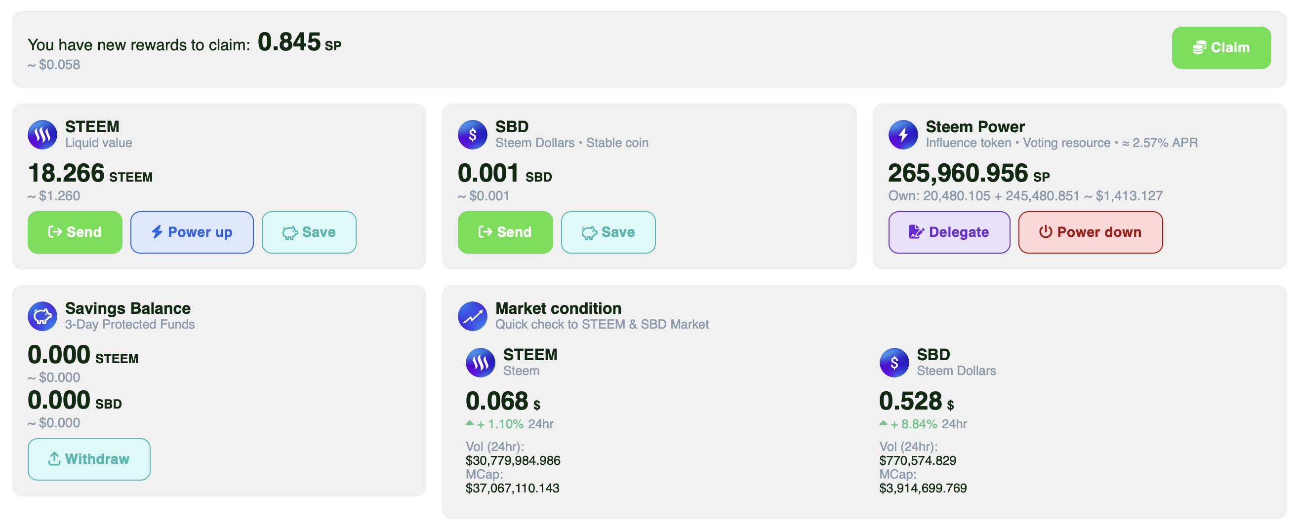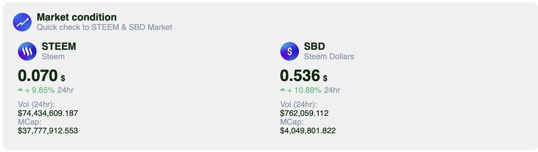 El componente de condición de mercado es un componente de información adicional que te ayudará a evaluar la condición de Steem en todo momento. Aunque fuimos capaces de calcular el precio del STEEM y SBD con métodos internos, también quisimos integrar información sobre el mercado externo para siempre tener un panorama completo. La información del precio en esta sección se obtiene con la API de CoinGecko.