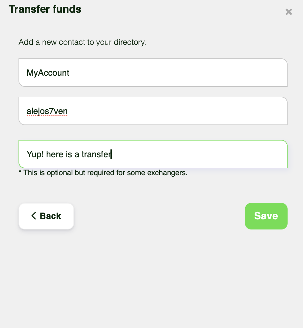 Acá podemos preconfigurar usuarios con sus memos facilitando así sobre todo la transferencia a exchangers de una forma sencilla, permitiendo almacenar configuraciones específicas y exactas ideales para transferir a estas plataformas sin margen de error. (NOTA: recuerda que a veces las plataformas de intercambio actualizan sus billeteras, asegúrate de qué sea la misma antes de enviar cualquier dinero)